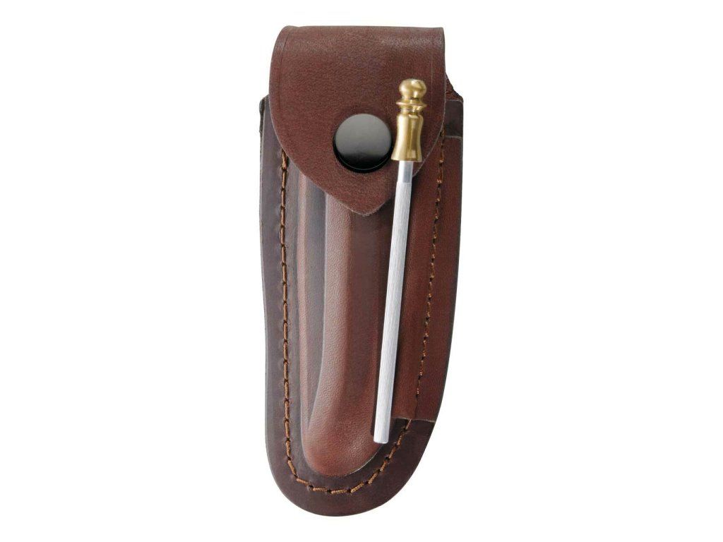 Hnedé kožené puzdro Herbertz 2676120 je navrhnuté pre nože Laguiole s dĺžkou rukoväte do 12 cm. Zapína sa na gombík, má pútko na opasok a tak sa dá nosiť pozdĺžne i priečne. Dodáva sa s 10 cm dlhou brúsnou ocieľkou.