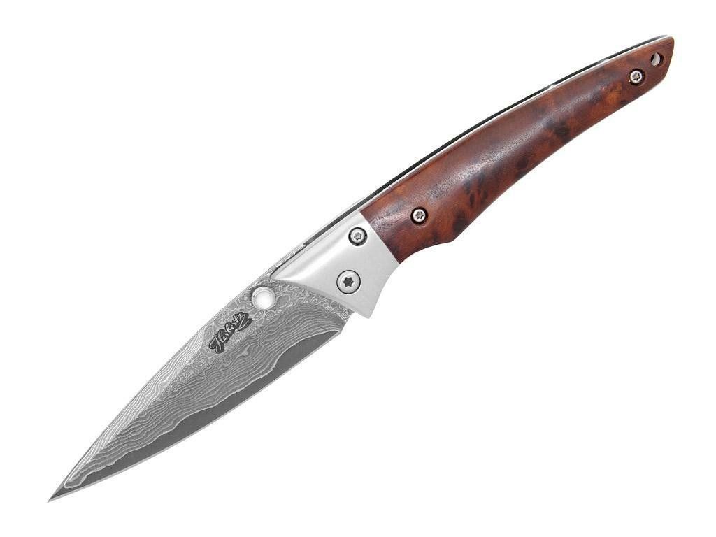 Má čepeľ s hladkou hranou s jadrom z ocele 440A s bokmi z damaškových plátkov s počtom 70 vrstiev. Otvára sa jednou rukou pomocou palcového kolíka a zaisťuje ju poistkou Linerlock.