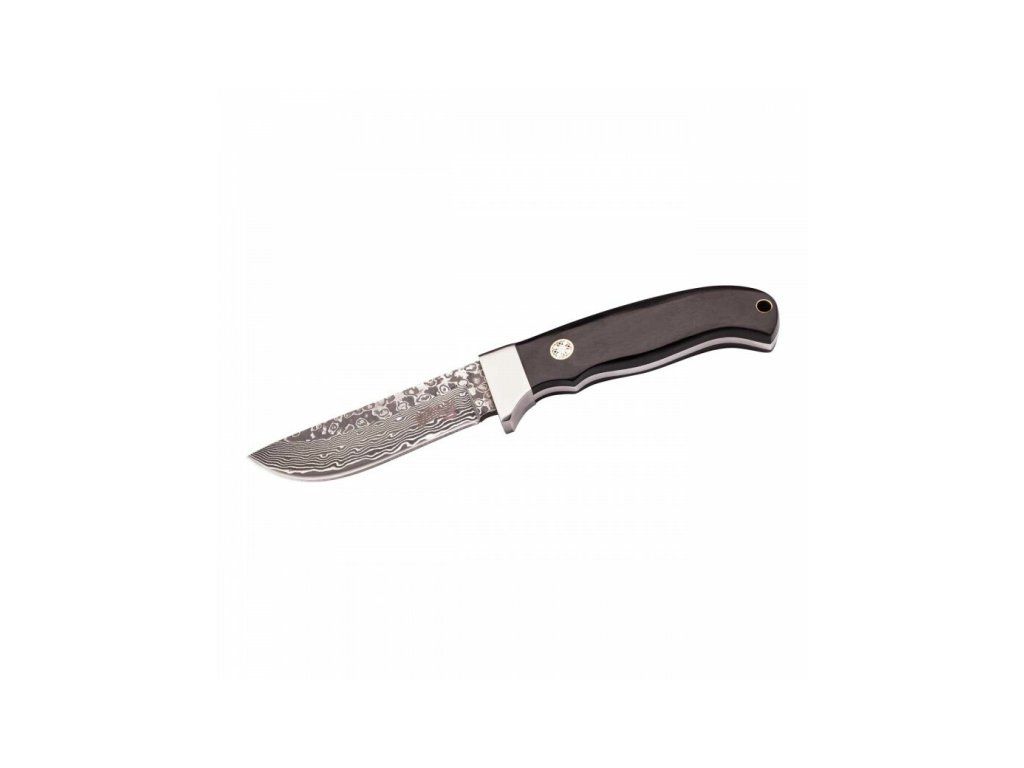 Má pevnú čepeľ s hladkou hranou typu Drop Point z 69 vrstiev damašku a s jadrom z nerezovej ocele AISI 440.