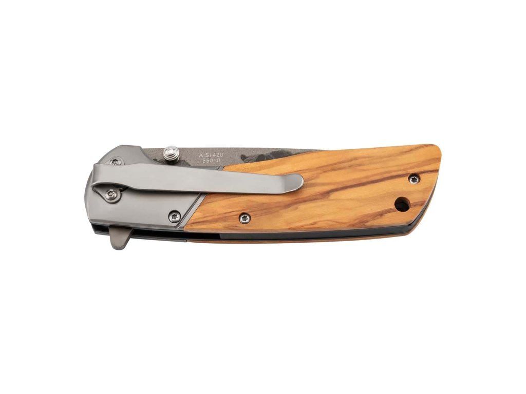 Rukoväť je z olivového dreva s oceľovým kovaním. S dierkou na šnúrku a sponou na vrecká.