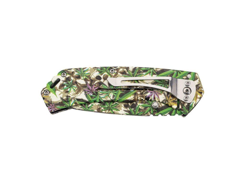 Celé telo rukoväte je z nehrdzavejúcej ocele, je kompletne 3D vytlačená s lebkami a farebnými konopnými listami. S dierkou na šnúrku a sponou na vrecká.