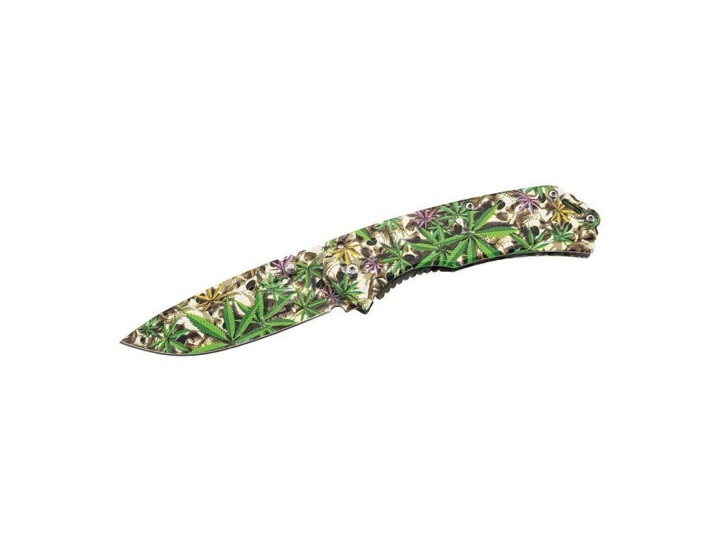 Má čepeľ s hladkou hranou typu Drop Point z nehrdzavejúcej ocele AISI 420, s potlačou s konopnými listami a lebkami, otvára sa obojstrannými palcovými kolíkmi a zaisťuje ju Framelock.