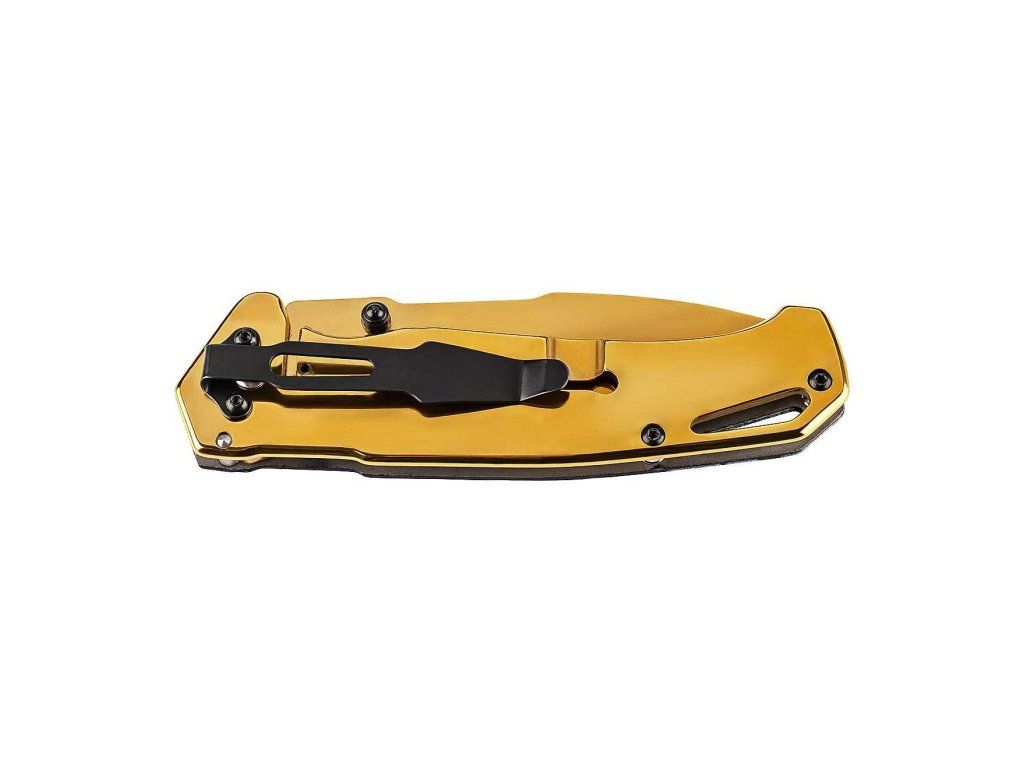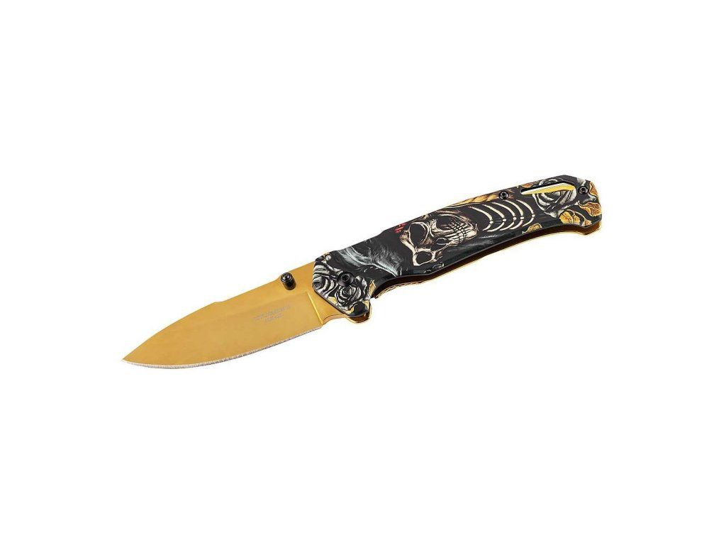 Zadná časť rukoväte má titánový povrch zlatej farby, pričom na prednej strane je strašidelný motív kostry. So sponou na vrecká.