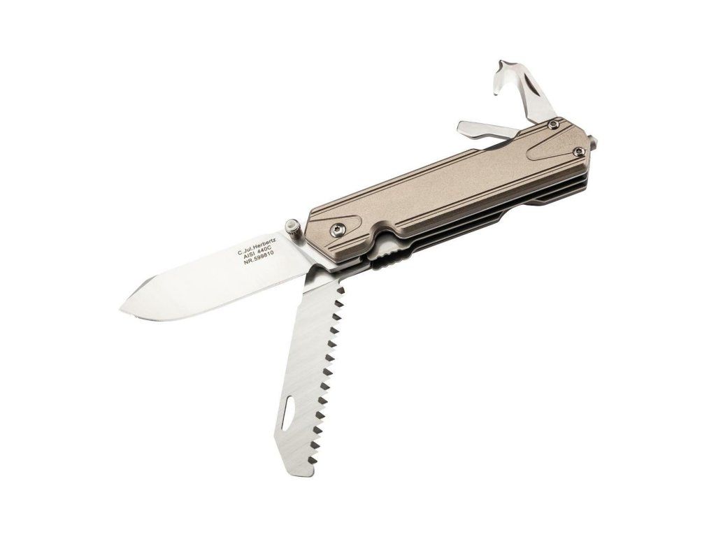 Multifunkčný jednoručný zatvárací nôž Herbertz 599810 7 Funktionen s celkom 7 funkciami - čepeľ, pílka, rezač pásov s krížovým skrutkovačom, otvárač na fľaše s plochým skrutkovačom, rozbíjač skla z karbidu wolfrámu.