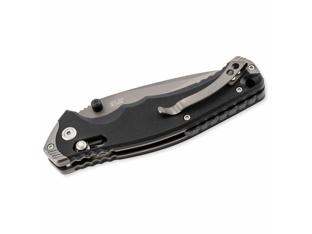 Anatomicky tvarovaná protišmyková rukoväť je z odolného G10 čiernej farby, s nitmi, pätkou a kovaním z ocele. S dierkou na šnúrku a sponou na vrecká.