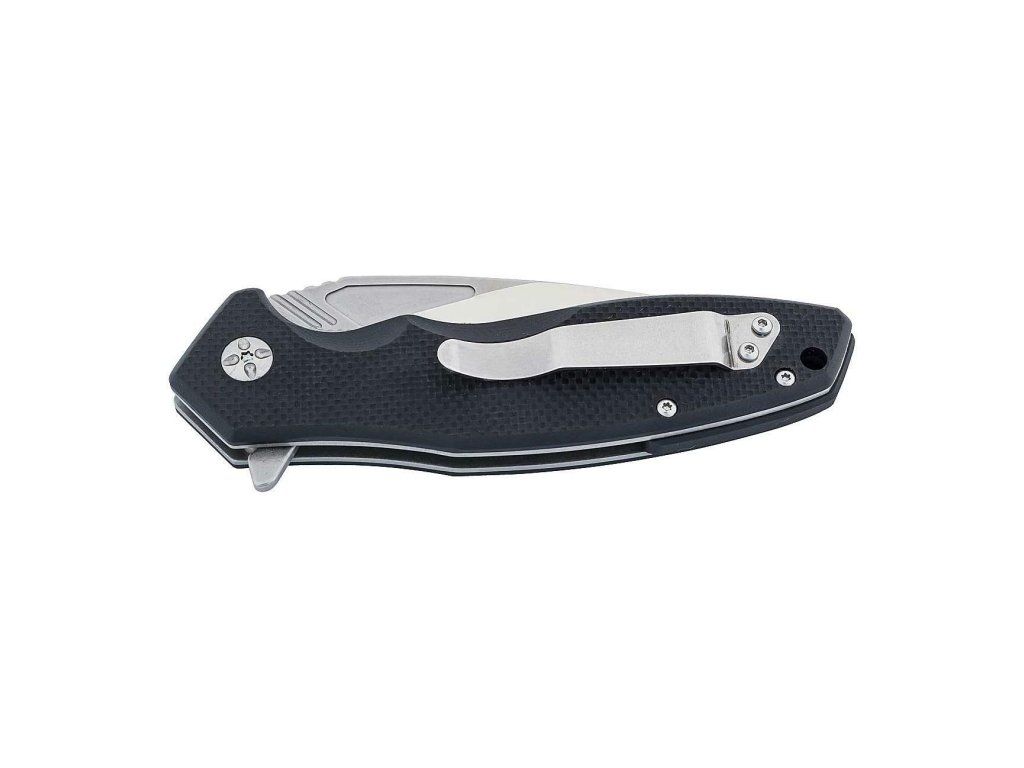 Rukoväť je z odolného protišmykového G10 čiernej farby, s dierkou na šnúrku a so sponou na vrecká.