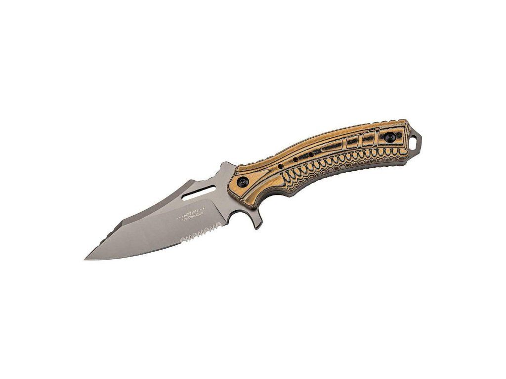 Má pevnú čepeľ s čiastočným zúbkovaním z nehrdzavejúcej ocele 440 potiahnutú titánom, prechádza celým nožom (full-tang).