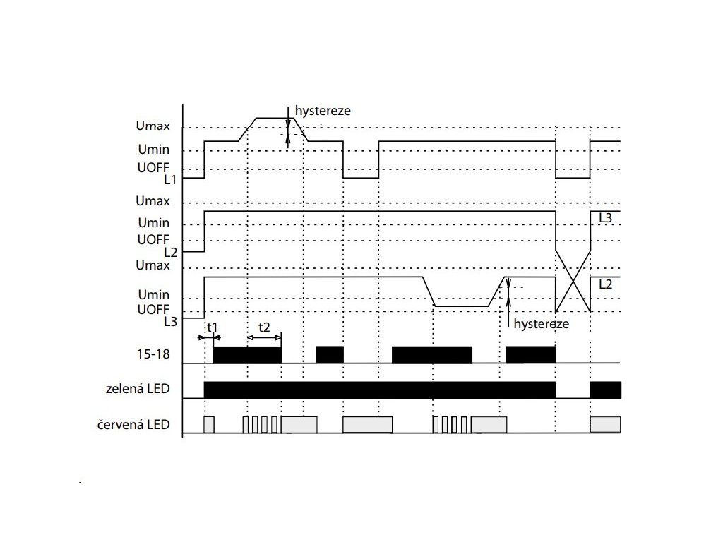 3. Co signalizuje blikající červená LED? Blikající červená LED indikuje, že došlo buď k výpadku jedné z fází, nebo k překročení povolených mezí hlídaného napětí (přepětí či podpětí).