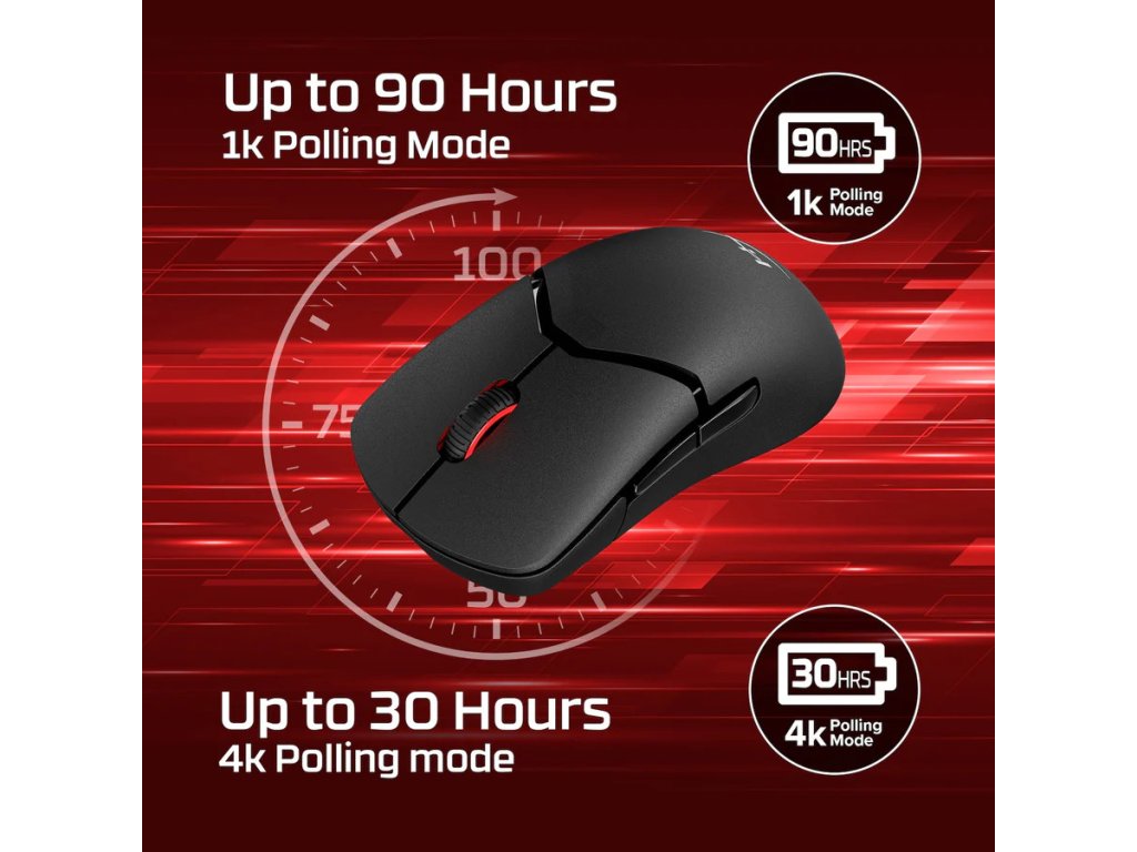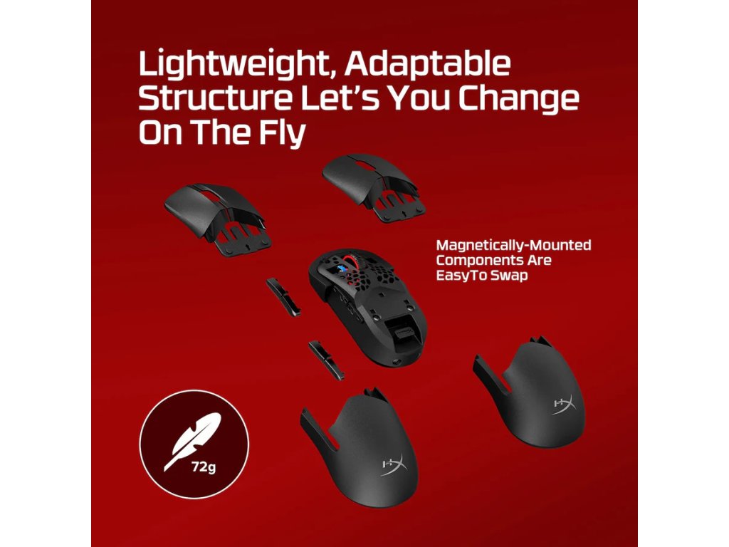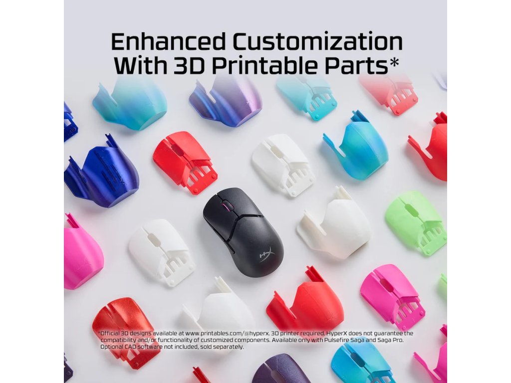 Bezdrátová herní myš HyperX Pulsefire Saga Pro *Výdrž baterie na jedno nabití až 90 hodin *Optické přepínače HyperX *Lehká konstrukce 72 g Pozdravte nejpřizpůsobitelnější herní myš HyperX: Pulsefire Saga Pro. Tato myš využívá ergonomicky navržené vyměnitelné součásti pro přizpůsobení různým stylům úchopu s až 16 pohodlnými kombinacemi. Jednoduše vyměňte magneticky namontované součásti a najděte své dokonalé přizpůsobení zcela bez nářadí. Ať už zvolíte jakoukoli konfiguraci, tato myš váží pouhých 72 gramů, takže nikdy nebudete muset obětovat obratnost kvůli pohodlí. Dlouhé herní seance? Žádný problém! Upgrady tím nekončí. Pulsefire Saga Pro je také vybaven optickými spínači HyperX, které vyvažují laserově přesné ovládání pomocí hmatového kliknutí. Na rozdíl od tradičních spínačů, které vyžadují mechanický kontakt, optické spínače využívají mechanismus spouštěný světlem, který převádí kliknutí na okamžité akce. Žádné odskoky, žádné zpoždění. Pulsefire Saga Pro také nabízí duální bezdrátové připojení, využívající vysokorychlostní 2,4 GHz bezdrátový dongle nebo Bluetooth s kompatibilními zařízeními. Nebo se zbavte hardwarového klíče pomocí funkce Instant Pair a připojte se k herním notebookům OMEN bez jakýchkoli dalších komponent. Připojte se k softwaru HyperX NGENUITY a nastavte sledování pohybu až do 26k DPI, přemapujte tlačítka, upravte rychlost dotazování, nastavte vlastní RGB efekty a sledujte výdrž baterie. Specifikace myši *Tvar: Modulární, Asymetrický *Senzor: HyperX 26K Senzor *Rozlišení: až 26 000 DPI *Předvolby DPI: 400/800/1600/3200 DPI *Rychlost: 650 IPS *Zrychlení: 50G *Tlačítka: 6 *Přepínače levého/pravého tlačítka: Optické přepínače HyperX *Světelné efekty: LED RGB osvětlení *Typ připojení: Bezdrátové 2,4 GHz, Bluetooth 5.0, Kabelové *Polling Rate: až 4000 Hz (2,4G – bezdrátové) *Životnost baterie: až 90 hodin (1000 Hz) Fyzikální specifikace *Délka: 119,7 mm *Výška: 39,8 mm *Šířka: 67,2 mm *Hmotnost: 2,54 oz / 0,16 lb *Typ kabelu: Odnímatelný, HyperFlex 2 kabel USB-C na USB-A *Délka kabelu (imperiální) a typ: 5,9 ft | Odnímatelný kabel HyperFlex 2 USB-C na USB-ADodatočné parametre