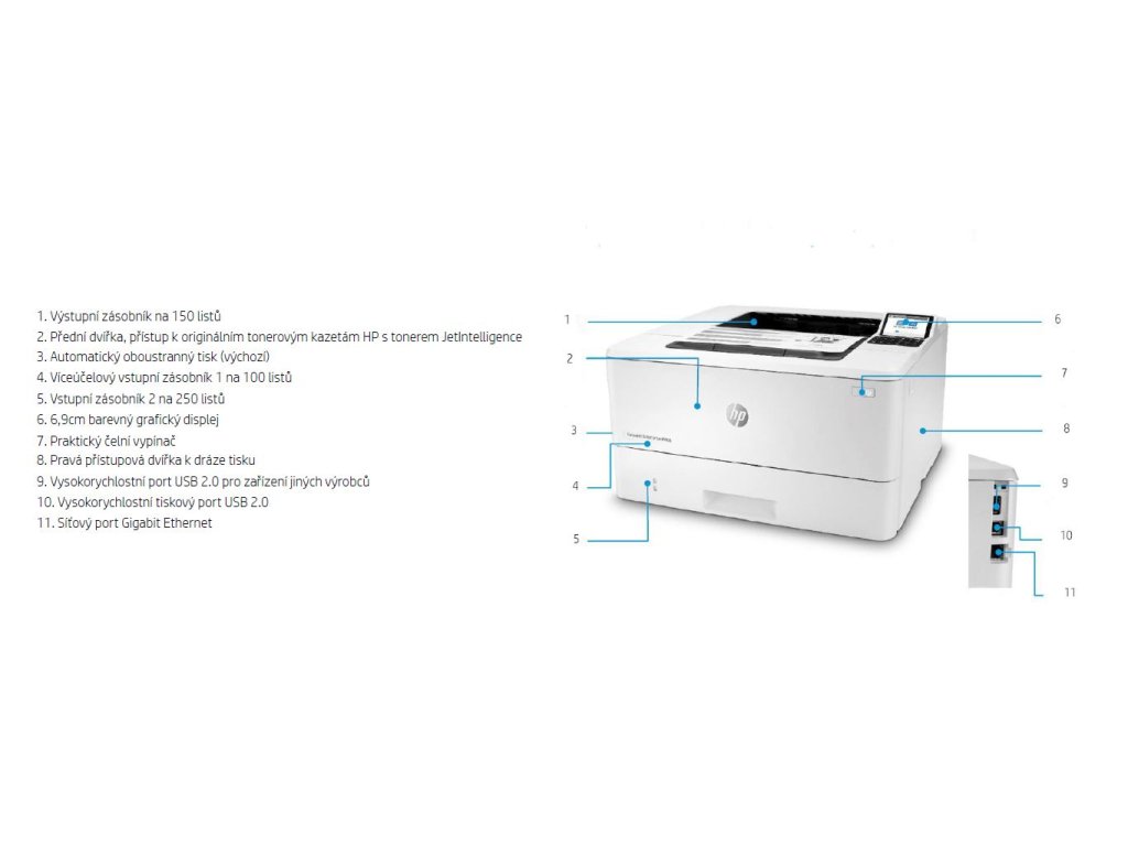 Malá a mocná: nejmenší tiskárna Enterprise od společnosti HP *Snadné použití, snadná správa * Nejzabezpečenější tisk na světě * Zvýšená produktivita pro podporu pracovních skupin * Udržitelnost je chytrou volbou pro každou firmu -6,85cm barevný nedotykový ovládací panel s 24 klávesami -Laser Formát tiskárny: A4 Rozlišení [DPI]: Až 1 200 x 1 200 dpi, Technologie: 300 dpi, 600 dpi, HP FastRes 1 200, HP ProRes 1 200 Rychlost černého tisku [str./min.]: (A4, normální): Až 38 str./min. (výchozí), Až 40 str./min. (režim HP High Speed), (A4, oboustranný): Až 31 obr./min. Tisk první strany [sec.]: (A4, připraveno): Již za 6,5 s, (A4, režim spánku): Již za 8,8 s Max. měsíční zatížení [str.]: Až 100 000 stran A4, Doporučený počet stran za měsíc: 900 až 4 800 stran Paměť: Standardní: 1 GB, Maximální: 1 GB Oboustranný tisk: Automaticky (výchozí) Kapacita zásobníku [str.]: Standardní: 2, Maximální: 3 *Standardní vstup: Zásobník 1 na 100 listů, vstupní zásobník 2 na 250 listů *Standardní výstup: Výstupní zásobník na 150 listů *Volitelný vstup: Volitelný třetí zásobník na 550 listů Rozhraní: *Standardní: 1 vysokorychlostní hostitelský port USB 2.0, 1 vysokorychlostní port USB 2.0, 1 síťový port Gigabit Ethernet 10/100/1000T *Volitelné: Příslušenství HP Jetdirect LAN 8FP31A, Příslušenství HP Jetdirect 3100w BLE/NFC/Wireless 3JN69A *Bezdrátové připojení: Volitelně, po zakoupení bezdrátového hardwarového příslušenství. Jednopásmová bezdrátová stanice a funkce Wi-Fi Direct jsou k dispozici u příslušenství HP Jetdirect 3100w BLE/NFC/Wireless 3JN69A *Možnost mobilního tisku: HP ePrint, Apple AirPrint, NFC touch-to-print (volitelně), Certifikace Mopria, Tisk Wi-Fi Direct, Podpora řešení ROAM pro snadný tisk, Tisk PrinterOn Tiskové jazyky: HP PCL 6, HP PCL 5, emulace HP PostScript 3. úrovně, nativní tisk PDF (v1.7), Apple AirPrint Skener: Ne Fax: Ne Spotřeba [W]: 531 W (probíhající tisk), 8,1 W (pohotovostní režim), 1,2 W (režim spánku), 0,07 W (automatické vypnutí / ruční zapnutí), 0,07 W (ruční vypnutí) Hlučnost [dB]: Zvukové emise – napájení: 6,5 B(A) při rychlosti 38 obr./min., Emise akustického tlaku: 54 dB(A) při rychlosti 38 obr./min. Rozměry [VxŠxH mm]: Min. 381 x 357 x 220 mm, Maximální: 381 x 781 x 241 mm (plně otevřená tiskárna) Hmotnost [kg]: cca 8,5 kg Podporované operační systémy: Windows Client OS (32/64bitový): Win10, Win 8.1, Win7 Ultimate, Mobilní operační systém: iOS, Android, Mac: Apple macOS High Sierra v10.13, Apple macOS Mojave v10.14, Apple macOS Catalina v10.15, Samostatný tiskový ovladač PCL6: další informace o podporovaných operačních systémech jsou k dispozici na adrese http://www.support.hp.com, kde zadáte název produktu a vyhledáte ho, pak stačí kliknout na „Uživatelské příručky“, zadat název produktu, vyhledat příslušnou uživatelskou příručku a najít část s podporovanými operačními systémy pro tiskové ovladače UPD PCL6 / PS, Podporované operační systémy: další informace o podporovaných operačních systémech jsou k dispozici na adrese http://www.hp.com/go/upd Obsah balení: Tiskárna HP LaserJet Enterprise M406dn, Černá originální tonerová kazeta HP LaserJet (cca 3 000 stran), Příručka Začínáme, 1x napájecí kabel Záruka: 12 měs.Tiskárna s dynamickým zabezpečením Některé tiskárny HP jsou určeny k provozu pouze s kazetami, které mají nový nebo znovu použitý čip HP nebo elektronické obvody. Tyto tiskárny používají dynamická bezpečnostní opatření k blokování kazet s jiným čipem nebo elektronickým obvodem než HP. Pravidelné aktualizace firmwaru zajišťují účinnost těchto opatření a blokují kazety, které dříve fungovaly. Opakovaně použité čipy a elektronické obvody HP umožňují využít opakovaně použitých, repasovaných či doplněných kazet. Více informací na https://support.hp.com/cz-cs/document/ish_7970978-7967198-16 Získejte po registraci 3letou prodlouženou záruku: https://h41201.www4.hp.com/WMCF.Web/cz/cs/promotion/14227/One/