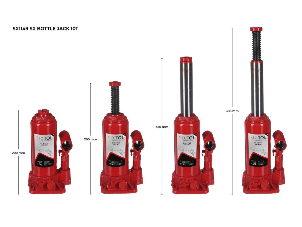 Šikovný hydraulický zvedák typu panenka SX BOTTLE JACK o nosnosti 10 t je nezbytným pomocníkem v každé garáži a dílně při výměně pneumatik nebo údržbě vašeho vozu. Pumpováním rukojeti dojde ke zvedání pístu a tím ke zvedání břemene, které je umístěno na jeho horní části. Každý zvedák má stanovenou nosnost, což je maximální hmotnost břemene, které je schopen zvednout. Zvedáky se používají při zvedání automobilů, kamionů, přívěsů, motocyklů a dalších těžkých břemen. Tyto hevery jsou kompaktní a snadno přenosné, což umožňuje jejich použití na různých místech. Díky své velikosti se vejde do kufru auta a v případě píchnutí kola na cestách ho jen vyndáte a snadno píchlou pneumatiku vyměníte. Panenky SX BOTTLE JACK jsou v horní části vybaveny nastavitelným šroubem, který po umístění pod auto vyšroubujete až k podvozku a následně auto heverem zvednete.Hlavní výhody: