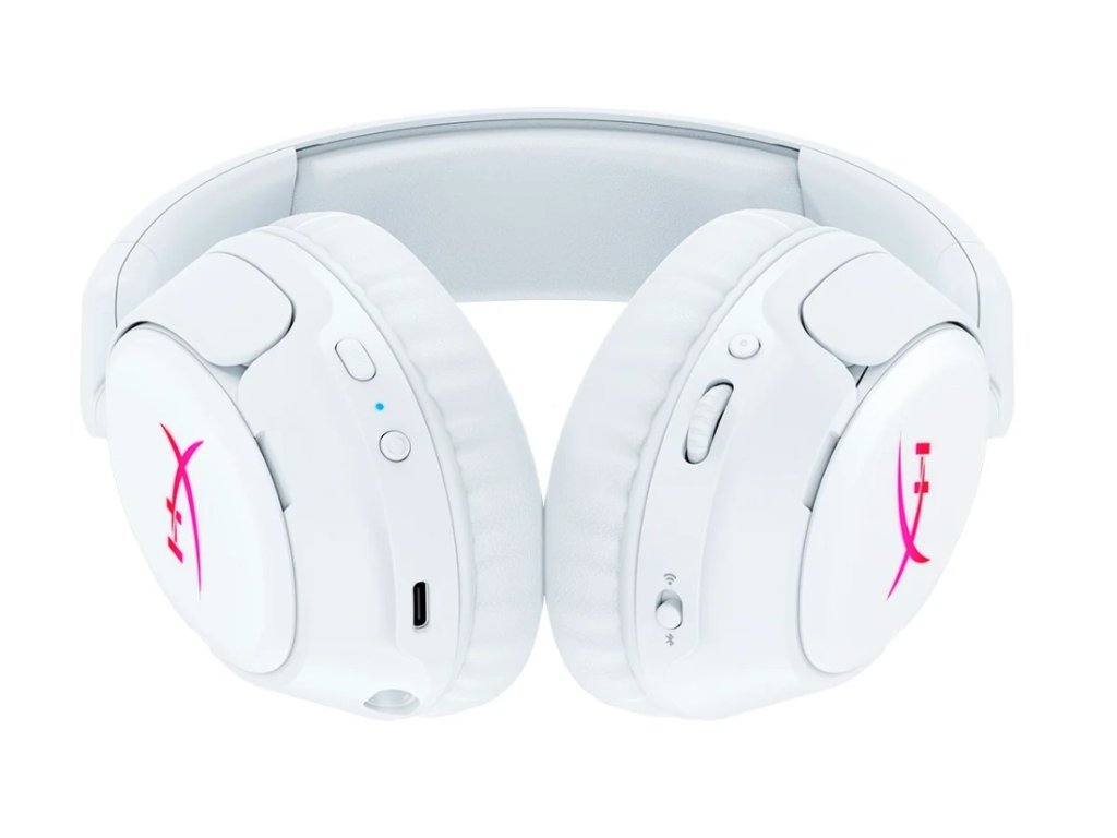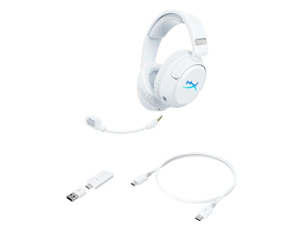 HyperX Cloud Flight 2 Wireles Gaming Headset Bílá Bezdrátová herní sluchátka, přizpůsobitelné RGB osvětlení s odnímatelnými kryty sluchátek, výdrž baterie až 100 hodin, duální bezdrátové připojení (2,4 GHz a Bluetooth), okamžité spárování s vybranými notebooky OMEN, kompatibilita s více platformami, šikmé 50mm měniče. Specifikace: Sluchátka Typ ovladače: Dynamický, 50mm Form factor: Přes hlavu Frekvenční odezva: 20Hz - 20kHz Citlivost: 103,5 dBSPL při 1 kHz (1 mW) Typ rámu: Plastový Boom mikrofon Směrová charakteristika: jednosměrná Frekvenční odezva: 100Hz - 10kHz Citlivost: -20,5dB Built-In mikrofon Směrová charakteristika: všesměrová Frekvenční odezva: 100Hz - 10kHz Citlivost: -15dB Konektivita Audio připojení: 2.4GHz Wireless USB, OMEN Instant Pair, Bluetooth USB Audio formát: Stereo playback, mono microphone USB: USB 2.0 Vzorkovací frekvence: 96/48kHz playback, 48kHz microphone Bitová hloubka: přehrávání 24/16 bitů, mikrofon 16 bitů ,  , Baterie Typ: Dobíjecí lithium-ion Nabíjecí doba: <, 3.5 hodin Bezdrátové připojení Typ: 2.4GHz, Bluetooth BT verze: 5.3 Dosah: až 20 metrů Podporované BT kodeky: ,SBC, MPEG-2 AACPodporované BT profily: AVRCP, A2DP, HFP, HSP Hmotnost: 340g (sluchátka), 11g (boom mic), 8g (USB wireless dongle) Kabel: 0,5m USB-C na USB-C cable Záruka: 2 rokyDodatočné parametre