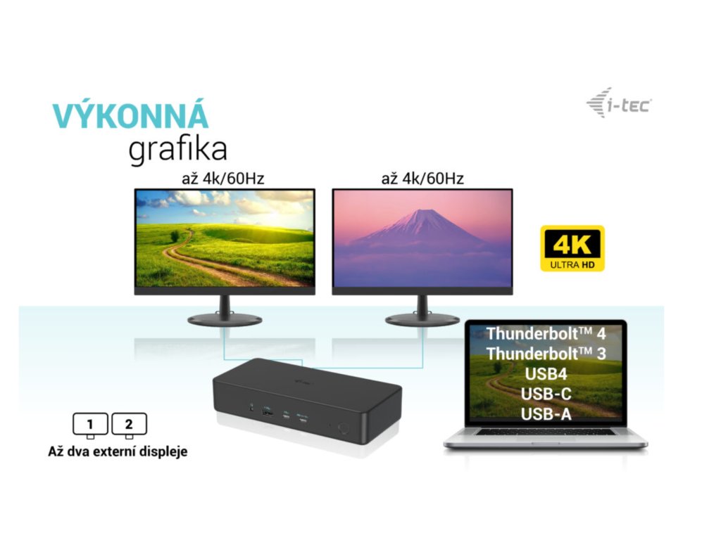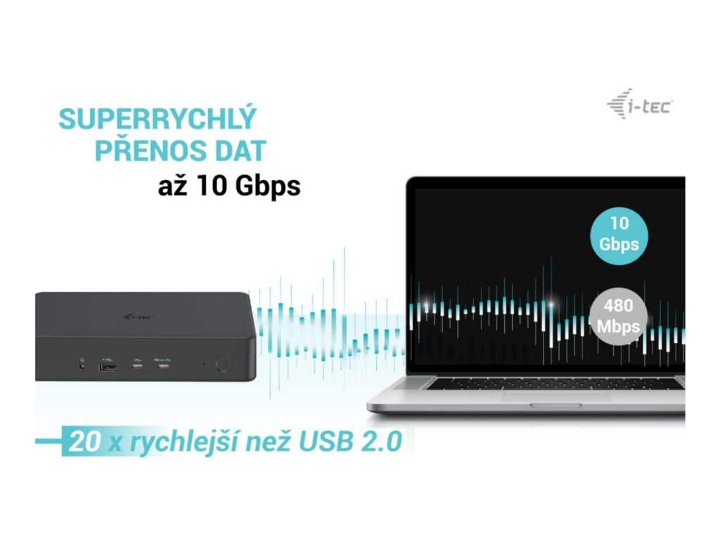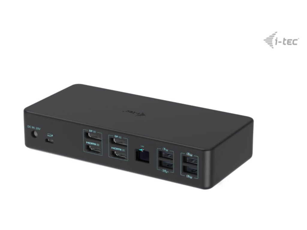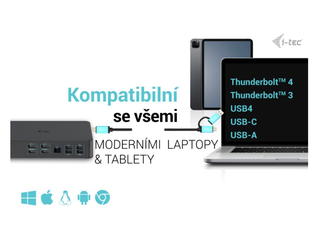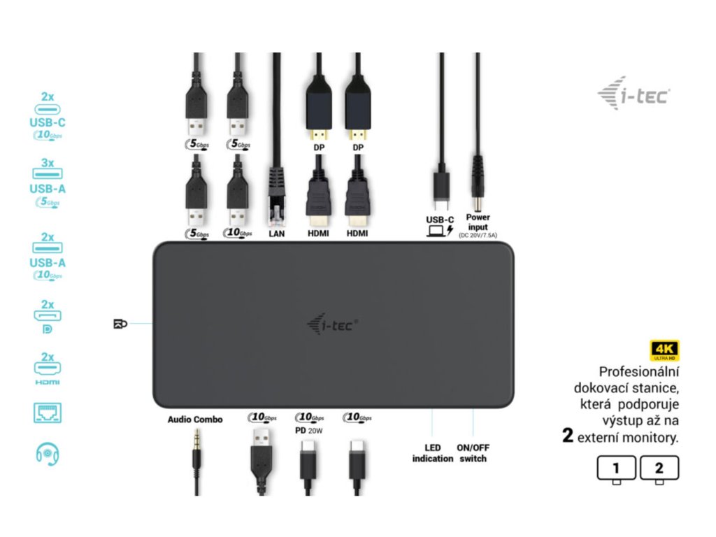 • Profesionální univerzální dokovací stanice, kompatibilní s notebooky a tablety s rozhraním USB-C, USB-A a Thunderbolt. • 2x DisplayPort a 2x HDMI podporující až dva displeje 4K/60Hz (platí i pro platformu Apple M1/M2) nebo jeden displej 5K/60Hz. • 7x USB portů včetně 2x USB-C Gen 2 (1x s podporou 20W PD nabíjení a jeden s podporou rychlého nabíjení BC 1.2) a 5x USB-A 3.2 (2x Gen 2 a 3x Gen 1), což usnadňuje připojení více USB zařízení a periferií pro superrychlý přenos dat. • Poskytuje až 100W Power Delivery pro kompatibilní notebooky a tablety s rozhraním USB-C a Thunderbolt. Hostitelské zařízení musí podporovat USB-C Power Delivery. • GLAN Ethernet podporuje síťové rychlosti 10/100/1000 Mb/s, čímž poskytuje robustní a vysokorychlostní připojení k internetu. • Kombinovaný vysoce kvalitní 32bit/192 kHz 3,5 mm audio vstup a výstupní konektor pro snadné připojení náhlavní soupravy nebo reproduktorů. • K dispozici držák VESA, který vám pomůže udržet pořádek na stole bez kabelů, a slot K-lock pro větší bezpečnost. Popis • Výkonná kancelářská dokovací stanice podporující superrychlé porty USB Gen 2 s rychlým nabíjením. Dokovací stanice podporuje výstup až na dva externí monitory ve vysokém rozlišení až 4K. Dokovací stanici lze použít prakticky se všemi notebooky, protože podporuje připojení ke všem běžným portům: 3.0, USB-C a Thunderbolt“ 3/4 a zároveň podporuje všechny běžné současné operační systémy. • Dostatek portů USB (dva porty USB-C podporují rychlost Gen 2 až 10 Gb/s), spolehlivé a rychlé připojení k firemní síti díky integrovanému portu LAN a podpora instalace za monitor, to vše dělá z této dokovací stanice ideálního společníka pro opravdové profesionály. Samozřejmě podporuje nabíjení notebooku nebo tabletu, a to až do výkonu 100 W. • Připojení 2 externích monitorů s rozlišením až 4K • Napájení: až 100 W • K dispozici 2 porty DisplayPort a 2 porty HDMI • 2x USB-C Gen 2 (10 Gb/s), 2x USB-A 3.2 Gen 2 (10 Gb/s) a 3x USB-A 3.2 Gen 1 (5 Gb/s) umožňují snadné připojení zařízení USB a periferií. • Porty USB podporují rychlé nabíjení: USB-C poskytuje PD až 20 W, další dva porty podporují rychlé nabíjení BC 1.2. • Gigabitový Ethernet RJ-45 poskytuje spolehlivé, robustní a vysokorychlostní připojení k internetu s podporou rychlostí 10/100/1000 Mb/s. • Kombinovaný konektor pro zvuk a mikrofon, velmi vysoká kvalita 32bit/192 kHz vzorkovací frekvence. • Zámek Kensington poskytuje ochranu proti krádeži, zejména ve sdíleném kancelářském prostředí nebo na veřejných místech. • Vypínač napájení dokovací stanice umožňuje maximální úsporu energie. • Dokovací stanice podporuje držák VESA pro inteligentní vertikální instalaci za monitor s podporou VESA. • Podporuje systémy Windows 10 / 11, macOS, Android 5 nebo novější, Chrome OS R51 nebo novější, Linux Ubuntu. POZNÁMKA: Pokud je dokovací stanice připojena přes port USB 3.0, nabíjení není podporováno. Specifikace • 1x port USB-C pro připojení k hostitelskému zařízení s portem USB-C nebo USB-A (kabel USB-C a adaptér z USB-C na USB 3.0 jsou součástí dodávky) • Technologie dokovací stanice: DisplayLink + USB-C PD • Napájení: 96 W • Video Porty: 2x Display Port (podpora DP++), 2x HDMI Podporovaná rozlišení: • 1 monitor – 1x DP › až 4K/60Hz • 1 monitor – 1x HDMI › až 4K/60Hz • 1 monitor – 2x DP › až 5K/60Hz* • 2 monitory – 1x DP + 1x DP › až 2x 4K/60Hz • 2 monitory – 1x DP + 1x HDMI › až 2x 4K/60Hz • 2 monitory – 1x HDMI + 1x HDMI › až 2x 4K/60Hz • 1x port USB-C 3.2 Gen 2 (pouze data), BC 1.2 • 1x port USB-C 3.2 Gen 2, PD 20W • 1x port USB 3.2 Gen 2, BC 1.2 • 1x port USB 3.2 Gen 2 • 3x port USB 3.2 Gen 1 • 1x port Ethernet GLAN RJ-45 (DisplayLink DL-6950) • 1x 3,5 mm kombinovaný audio port, podporující vysoce kvalitní vzorkovací frekvenci 32bit/192 kHz a záznam • 1x vstup napájení (DC 20V/7,5A) • Klonování adres MAC: Ano (pomocí softwaru i-tec Docker Pro) • WOL: S1, S2, S3 • Vypínač pro zapnutí a vypnutí dokovací stanice • Indikátor LED • Podpora zámku Kensington • Podpora montáže VESA • Kabel USB-C s adaptérem USB-C na USB-A (100 cm) • Operační systém: Windows 10 / 11, macOS, Android 5 nebo novější, Chrome OS R51 nebo novější, Linux Ubuntu • Snadná instalace ovladačů (Windows, MacOS, Ubuntu, Android (externí odkaz)) • Rozměry produktu: 190 x 88 x 37 mm • Hmotnost výrobku: 539 g • Rozměry balení: 253 x 200 x 54 mm ** Rozlišení 5K je podporováno pouze systémem Windows Požadavky na hardware: • Zařízení s volným portem USB-A, USB-C, USB4 nebo Thunderbolt™ 3/4. Požadavky na funkci Power Delivery: • Zařízení s volným portem USB-C, USB4 nebo Thunderbolt™3 s podporou funkce „Power Delivery“. Operační systém: • Windows 10 / 11, macOS, Android 5 nebo novější, Chrome OS R51 nebo novější, Linux Ubuntu !!! Pokud je dokovací stanice připojena přes port USB 3.0, nabíjení není podporováno !!! Obsah balení : • Produkt • Napájecí adaptér 150W • Kabel USB-C na USB-C/USB-A (100 cm) • ManuálDodatočné parametre