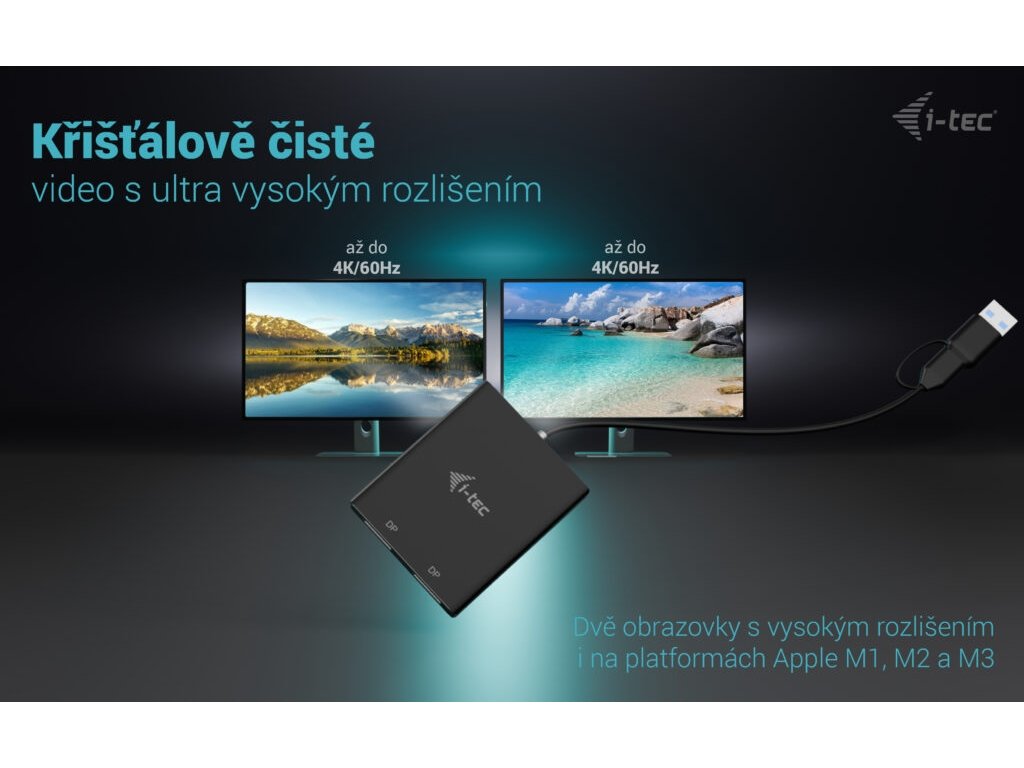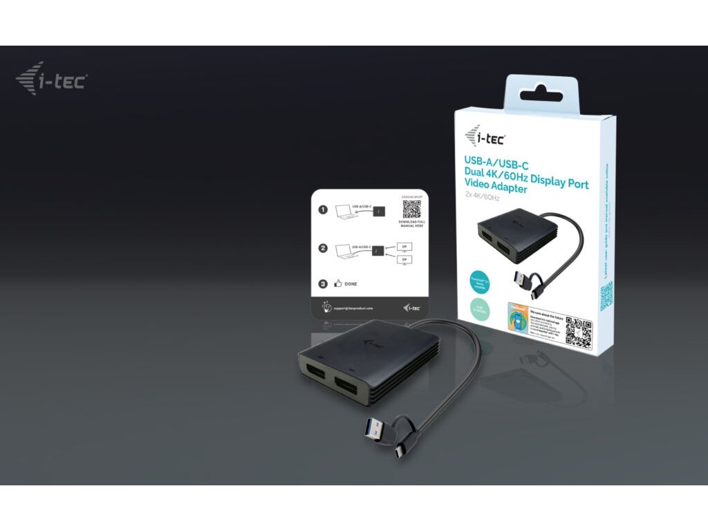 • Univerzální připojení: kompatibilní s porty USB-C, USB-A a Thunderbolt • Výkonný a všestranný videoadaptér, který dokáže připojit až dva monitory současně. • Adaptér podporuje rozlišení až 2x 4K/60 Hz bez ohledu na výkon grafické karty vašeho notebooku. • Podpora dvou portů DisplayPort. • Kovový povrch pro lepší odvod tepla. • Dva externí monitory jsou podporovány i na platformách Apple M1, M2 a M3. • Adaptér je kompatibilní se všemi hlavními operačními systémy. Rozšiřte svou pracovní plochu o dva externí monitory DisplayPort. Adaptér podporuje 2x rozlišení 4K 4096×2160@60Hz včetně zvukového signálu. Adaptér je vhodný pro designéry, grafiky a další uživatele, kteří pracují s více obrazovkami současně. Jeho výkon umožňuje spouštět i ty nejnáročnější aplikace na jednom nebo dvou nezávislých monitorech, takže je ideální pro střih 4K/60Hz videa nebo jiné úlohy v rozlišení Ultra HD Díky režimům „Rozšíření“ a „Zrcadlení“ můžete pracovat s aplikacemi na dvou monitorech (např. velké tabulky), pracovat na jednom monitoru a na druhém vyhledávat informace na internetu, porovnávat několik dokumentů najednou, aniž byste museli neustále přeskakovat mezi otevřenými okny, prohlížet panoramatické snímky na dvou monitorech, zobrazovat grafy a aktuální data současně, prohlížet několik prezentací najednou, aniž byste museli mít další počítač atd. Před použitím adaptéru je nutná krátká jednorázová instalace ovladače DisplayLink. Další informace naleznete na adrese http://www.i-tec.pro/setup-2. Specifikace • 1x integrovaný USB-C/USB-A kabel pro připojení k hostitelskému zařízení (27 cm) • Technologie grafického adaptéru: DisplayLink Video porty: 2x DisplayPort Podporovaná rozlišení: 1 monitor – 1x DP › až 1x 4K/60Hz 2 monitory – 1x DP + 1x DP › až 2x 4K/60 Hz • OS: Windows 10/11, macOS, Android 5 nebo novější, Chrome OS R51 nebo novější, Linux Ubuntu • Rozměry produktu: 75 x 60 x 15 mm • Hmotnost produktu: 80 g • Rozměry balení: 180 x 130 x 25 mm • Hmotnost balení: 180 g • Hardwarové požadavky: Zařízení s volným portem USB-A, USB-C, USB4 nebo Thunderbolt™ 3/4 Obsah balení • Produkt • QuickStartDodatočné parametre
