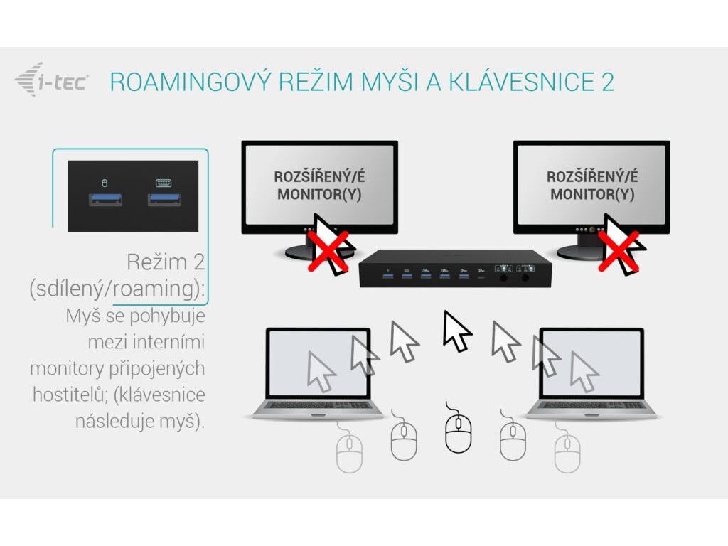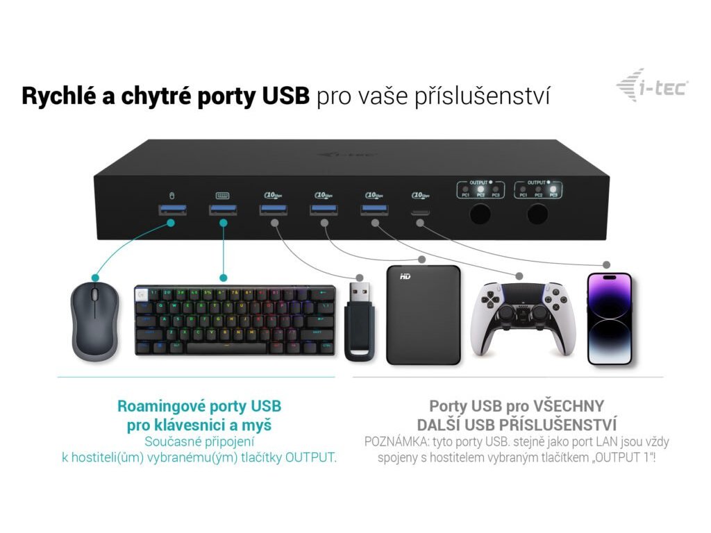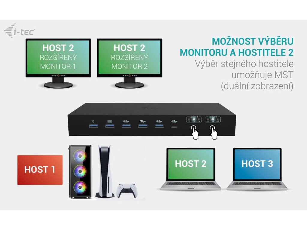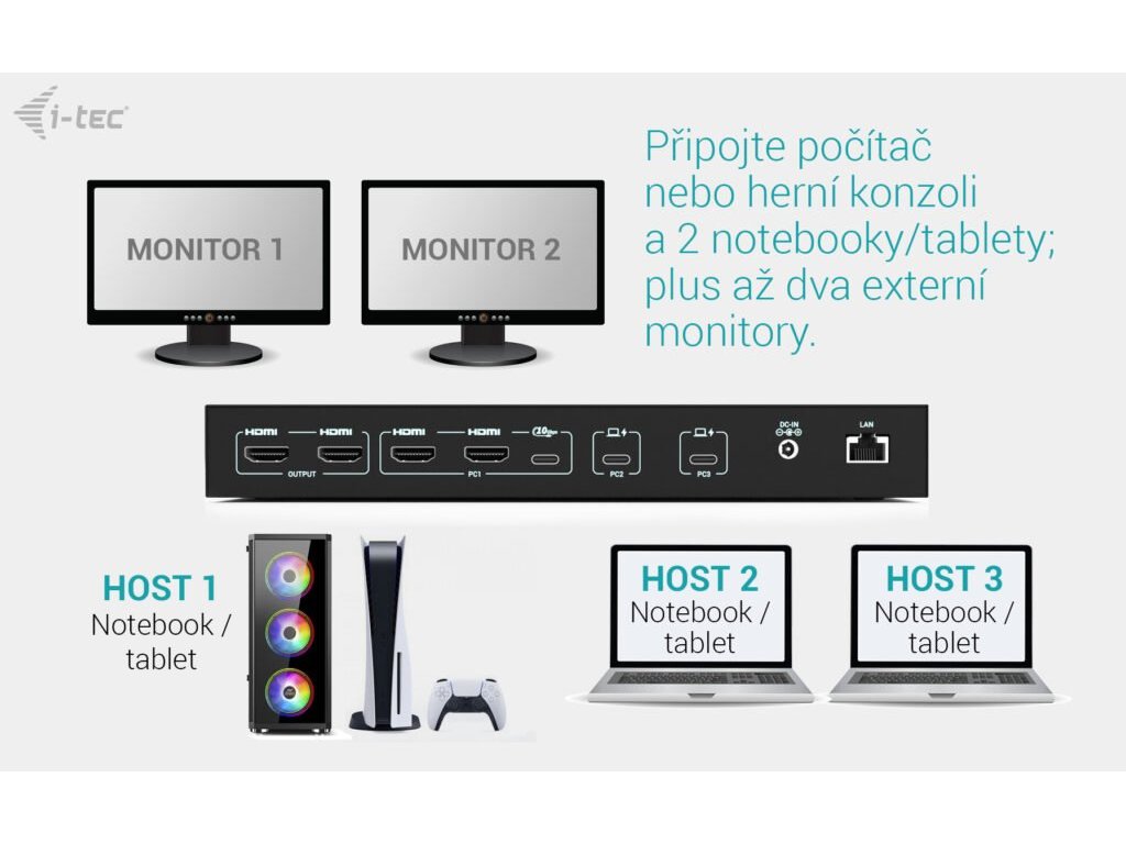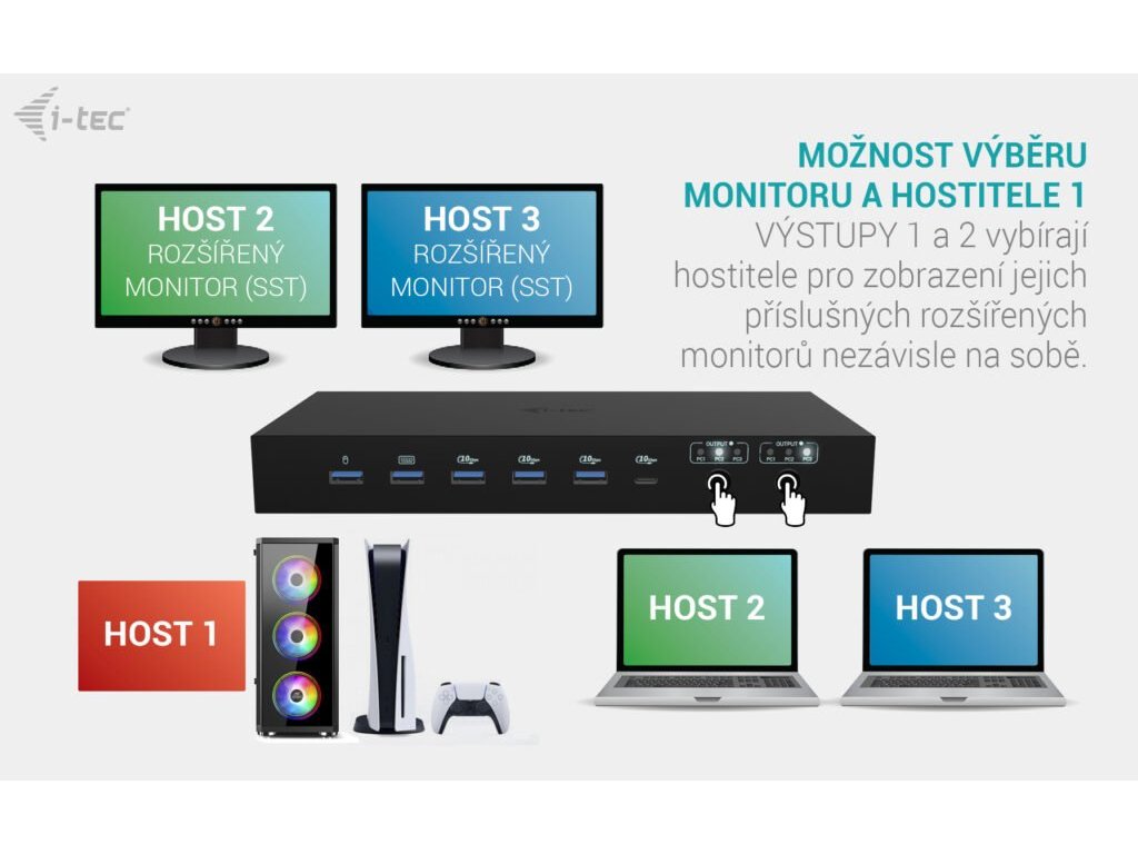 Prémiová KVM dokovací stanice až pro tři zařízení Tato vysoce výkonná dokovací stanice umožňuje současné připojení až tří hostitelských zařízení – jednoho PC nebo herní konzole a dvou notebooků či tabletů. Je plně kompatibilní se zařízeními s porty USB-C, USB4 nebo Thunderbolt 3/4/5. Počítače nebo konzole lze připojit přes HDMI a USB. Podporuje až dva externí monitory, které mohou zobrazovat buď obsah z jednoho hostitele, nebo každý z jiného – ideální pro multitasking a práci ve více systémech současně. Díky dvěma USB roamingovým portům můžete klávesnici a myš sdílet mezi dvěma hostiteli najednou, což zvyšuje komfort a produktivitu. Stanice nabízí také čtyři vysokorychlostní USB porty (10 Gbps) pro připojení periferií, a plnou konektivitu včetně GLAN, audio a mikrofonního vstupu. Inteligentní napájení umožňuje nabíjení jednoho notebooku výkonem až 92 W, nebo dvou zařízení současně po 45 W. Díky praktickým přepínačům výstupů si můžete snadno zvolit, zda budou oba monitory pracovat s jedním hostitelem, nebo se zobrazí výstup ze dvou zařízení zároveň – ideální pro paralelní pracovní toky. Hlavní vlastnosti: • Podpora až 3 hostitelských zařízení (2× notebook/tablet + 1× herní konzole/PC) • Možnost připojit až 2 externí monitory s rozlišením až 4K/60 Hz * • 2 chytré USB porty pro klávesnici a myš s funkcí sdílení (roaming) • 4 rychlé USB porty s rychlostí 10 Gbps (3× USB-A a 1× USB-C s nabíjením až 15 W) • LAN port s rychlostí až 1 Gbps (10/100/1000 Mbit) • 2× 3,5mm audio porty pro sluchátka a mikrofon • Napájení: 1× 92 W nebo 2× 45 W • 2× nezávislá tlačítka OUTPUT pro výběr aktivního hostitele (tlačítko OUTPUT 1 zároveň slouží jako vypínač stanice) '* Poznámka: macOS nepodporuje technologii MST (Multi-Stream Transport) pro rozšířený výstup videa na více monitorů. V důsledku toho se při použití macOS na obou připojených monitorech zobrazuje stejný (zrcadlený) obraz. Specifikace: • 2× USB-C port pro připojení zařízení s USB-C (PC2, PC3) • 2× HDMI vstup z hostitelského zařízení (PC1*/**) • 1× USB-C datový vstup z hostitelského zařízení (PC1*/*/**) • Technologie dokovací stanice: USB-C DP Alt. mode + USB-C PD + KVM přepínač • Power Delivery: PC2 – 65W, PC3 – 65W, při připojení jednoho hostitele (PC2 nebo PC3): 92W • Vstupy videa: 2× HDMI 2.0 (PC1) + 2× USB-C (PC2, PC3) • Výstupy videa: 2× HDMI 2.0 Rozlišení: (závisí na schopnostech hostitelského zařízení) Hostitelské zařízení s DisplayPort 1.2, 1.4, 1.4 DSC nebo HDMI: • 1 monitor – 1× HDMI – až 4K/60Hz nebo 1440p/144Hz • 2 monitory – 2× HDMI – až 4K/60Hz nebo 1440p/144Hz* • 1× USB-C 3.2 Gen 2 (10 Gbps) s podporou napájení až 20 W*** • 3× USB 3.2 Gen 2 (10 Gbps)*** • 2× USB 1.1 (určeno pro klávesnici a myš)*** • 1× Ethernet RJ-45 1 Gbps*** • 1× 3,5mm vstup pro mikrofon*** • 1× 3,5mm výstup pro sluchátka*** • 1× napájecí vstup (DC 20 V / 9 A, 180 W) • LED indikátory – signalizace napájení a aktivních hostitelů • 2× tlačítko – přepínání vstupů pro výstupy 1 a 2, funkce zapnutí/vypnutí podržením tlačítka OUTPUT 1 po dobu 2 sekund • Operační systémy: Windows 10/11, macOS*, Android*, iPadOS*, ChromeOS, Linux • Rozměry produktu: 240 × 115 × 30 mm • Hmotnost produktu: 797 g Hardwarové požadavky: • Zařízení s volným portem USB-A, USB-C, USB4 nebo Thunderbolt™ 3, 4 nebo 5 Požadavky na napájení (Power Delivery): • Zařízení s volným portem USB-C, USB4 nebo Thunderbolt™ 3, 4 nebo 5 s podporou Power Delivery Požadavky na výstup videa: • Zařízení s volným portem HDMI, USB-C nebo USB4 s podporou DisplayPort Alternate Mode nebo Thunderbolt™ 3, 4 nebo 5 • Windows 10 / 11, macOS*, Android*, iPadOS*, ChromeOS, Linux '* Upozornění: macOS nepodporuje technologii Multi-Stream Transport (MST) pro víceobrazový výstup. V důsledku toho bude při použití macOS na obou připojených monitorech zobrazen stejný (zrcadlený) obraz. Toto chování platí i pro jiné operační systémy, které MST nepodporují. V prostředí macOS je MST omezeno pouze na jedno rozšířené zobrazení, druhý monitor bude vždy zrcadlit první. Navíc samotné připojení jednoho HDMI kabelu ke vstupu PC1 neumožní použití MST. Pro duální výstup videa z hostitele PC1 je nutné připojit oba HDMI vstupy do zařízení PC1. '** Vstup PC1 je určen pro zařízení s výstupem videa přes HDMI, jako jsou stolní počítače, herní konzole a podobná zařízení. Pokud chcete sdílet stejná USB periferní zařízení používaná s PC2 a PC3, připojte datový USB kabel z vašeho zařízení (typicky PC nebo konzole) do portu USB-C označeného jako PC1. *** USB data (včetně USB, Ethernetu a audia) vždy následují výběr hostitele na výstupu Output 1. Poznámka: Funkce roamingu pro myš a klávesnici je k dispozici – podrobnosti naleznete v uživatelské příručce. Obsah balení : • Obsah balení • Produkt • 2× kabel USB-C – USB-C (100 cm), 1× kabel USB-C – USB-A (100 cm) • Návod k použití • Napájecí adaptér (DC 20V/9A, 180 W) • Napájecí kabelDodatočné parametre