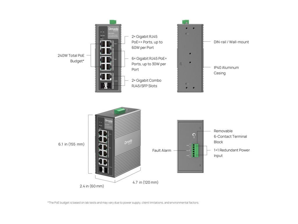 TP-Link IES210GPP Omada switch průmyslový 10portový gigabitový Easy Managed PoE switch se 6 porty PoE+ a 2 porty PoE++ Hlavní přednosti: * 8× gigabitových RJ45 portů (2× PoE++, 6× PoE+) * 2× gigabitové kombinované RJ45/SFP sloty * vysoký PoE budget 240W s podporou až 60 W na každý PoE++ port pro napájení energeticky náročných zařízení (jako PTZ kamery, přístupové body nebo IP telefony) * profesionální průmyslový design - provozní teplota -40 °C až 75 °C, přepěťová ochrana 6kV a redundantní napájení 1+1 (dva nezávislé napájecí vstupy) pro nepřetržitý provoz * centralizovaná správa cloudu prostřednictvím webu nebo aplikace Omada Cloud Essentials * bohatá výbava - PoE až do vzdálenosti 250 m, podpora pokročilých funkcí včetně VLAN, QoS a STP/RSTP * odolný hliníkový kryt s krytím IP40 a s možností montáže na stěnu nebo DIN lištu pro snadnou instalaci v průmyslovém prostředí Hardwarové parametry Rozhraní: * 2× porty 10/100/1000 Mbps PoE++ RJ45 * 6× porty 10/100/1000 Mbps PoE+ RJ45 * 2× kombinované sloty Gigabit SFP/RJ45 * Auto-Negotiation/Auto MDI/MDIX PoE porty (RJ45): * Standard: kompatibilní s 802.3af/at/bt * Porty PoE++ (802.3af/at/bt PoE): 2 porty, až 60 W na port * Porty PoE+ (802.3af/at PoE): 6 portů, až 30 W na port * Rozpočet PoE: - 60 W (vstup: 12 V / 7,2 A - 21 V / 3,7 A)) - 120 W (vstup: 21 V / 6,7 A - 46 V / 3,1 A) - 240 W (vstup: 46 V / 5,7 A - 57 V / 4,4 A) * rychlé PoE * trvalé PoE Napájení: 12–57 V 1+1 redundantní stejnosměrný napájecí vstup Max. spotřeba energie: 85,74 W (60W PD), 139,75 W (120W PD), 258,33W (240W PD) Ochrana proti přepětí: ±6 kV v běžném režimu pro ethernetové porty, ±4 kV v běžném režimu pro vstupní porty stejnosměrného napájení Počet ventilátorů: bez ventilátoru Bezpečnostní zámek: ano Form Factor-instalace: flexibilní montáž na stěnu, na DIN lištu IP krytí: IP40 (ochrana proti prachu a mechanickému poškození) Výkon: Kapacita switche: 20 Gb/s Velikost vyrovnávací paměti paketů: 4 Mbit Rychlost přeposílání paketů: 14,88 Mpps Velikost tabulky MAC adres: 8k Jumbo rámec: 15 KB Funkce přepínání na vrstvě L2: ano VLAN: založená na portech (max. 32 skupin) Funkce správy: * Omada aplikace: ano (vyžaduje použití hardwarového ovladače Omada, cloudového ovladače Omada nebo softwarového ovladače Omada) * centralizovaná správa: cloudový, hardwarový a softwarový ovladač Omada Rozměry: 155 x 120 x 60 mm Hmotnost: 1180 g Obsah balení: * switch IES210GPP * montážní konzole na DIN lištu * desky pro montáž na stěnu (šroubky) * instalační příručka Záruka: 60 měs. Odkaz na web výrobce: https://www.omadanetworks.com/cz/business-networking/omada-switch-industrial/ies210gpp/#specificationsDodatočné parametre