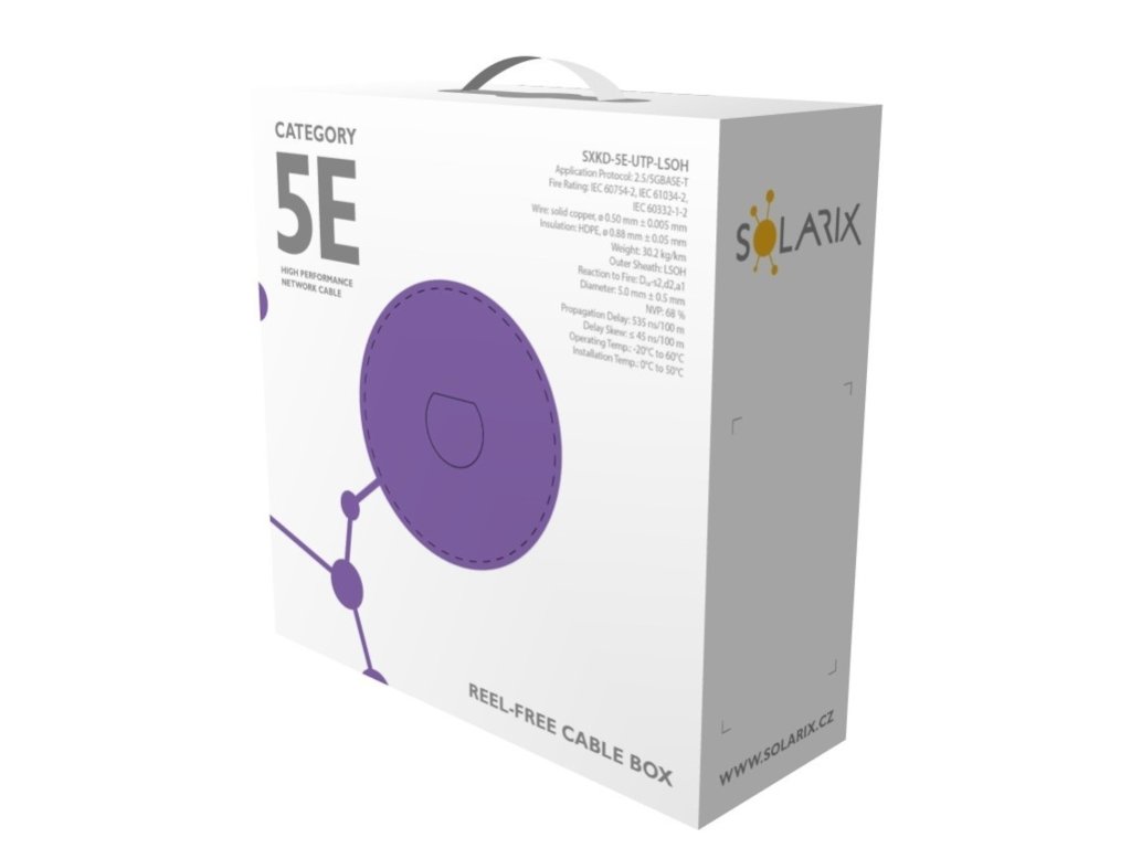 POZOR, nový 100 metrový box. Instalační kabel Solarix s označením SXKD-5E-UTP-LSOH je spolehlivý nestíněný kabel kategorie 5E, který je testován až do šířky pásma 350 MHz, a je určený pro provoz ethernetových protokolů, včetně 2.5GBASE-T a 5GBASE-T*. Konstrukce kabelu je U/UTP, typ pláště LSOH s třídou reakce na oheň Dca-s1,d2,a1. Vodiče kabelu jsou vyrobeny z kvalitního měděného drátu s čistotou mědi 99,97%. Kabel bez problémů splňuje požadavky z mezinárodních standardů ISO/IEC 11801, EN 50173 a ANSI/TIA 568.2-D. Výkonové parametry tohoto kabelu byly otestovány nezávislou testovací zkušebnou FORCE TECHNOLOGY v rámci programu EC Verified, a to na nejvyšší úroveň tzv. Component Level. Certifikát je k dispozici zde na webu v záložce "Soubory ke stažení" nebo přímo na stránkách laboratoře FORCE. V případě CPR (nařízení EU č. 305/2011) je kabel testován v systému posuzování vlastností AVCP 3. Stejně jako ostatní kabely Solarix, je i kabel SXKD-5E-UTP-LSOH značen metráží po 1 m v rozsahu od 0 do 100 m. Kabel je dodáván ve vysoce odolném třívrstvém leštěném kartónovém boxu (vždy barevně odlišeném podle typu kabelu), na kterém jsou uvedeny všechny nezbytné produktové informace, včetně čárových kódů, výrobní šarže, popisu a nejdůležitějších technických parametrů.Klíčové vlastnosti kabelu Solarix kategorie 5E