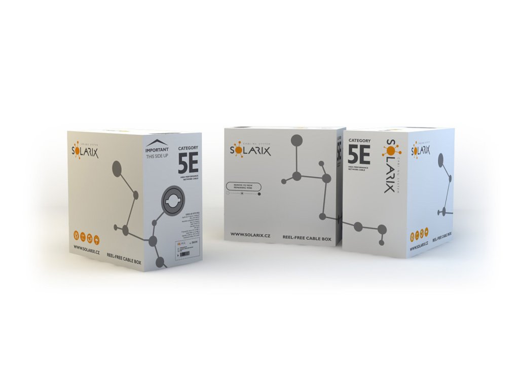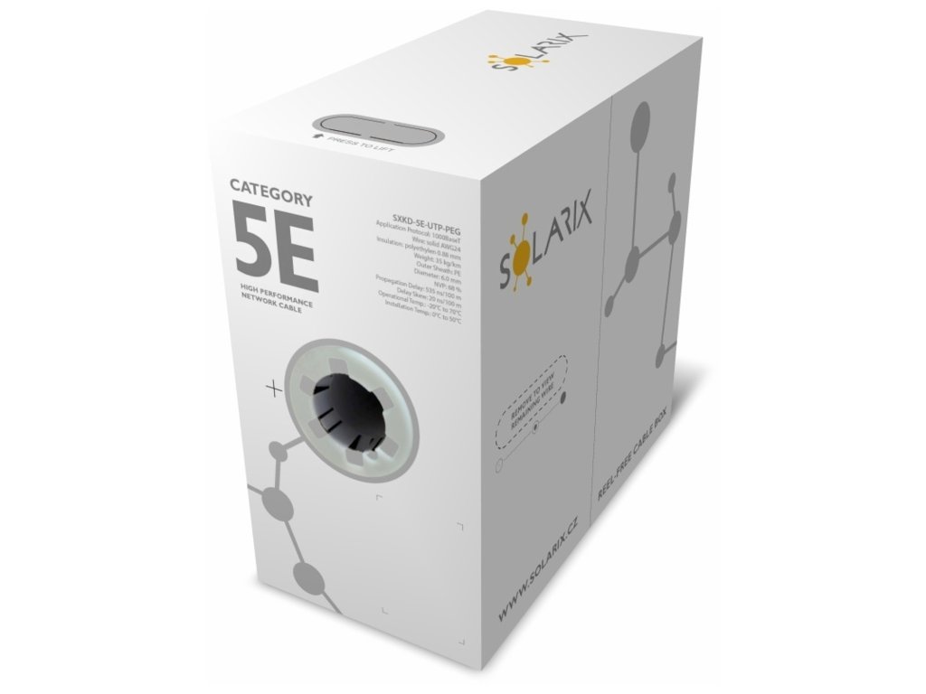 Instalační kabel Solarix s označením SXKD-5E-UTP-PEG je spolehlivý venkovní nestíněný kabel kategorie 5E, který je určený pro provoz ethernetových protokolů, včetně 2.5GBASE-T a 5GBASE-T*. Konstrukce kabelu je U/UTP, kabel je rovněž vyplněn gelem pro zajištění lepší odolnost proti vlhkosti. Typ pláště je UV stabilní PE s třídou reakce na oheň Fca a stupněm krytí IP67. Vodiče kabelu jsou vyrobeny z kvalitního měděného drátu s čistotou mědi 99,97%. Kabel bez problémů splňuje požadavky z mezinárodních standardů ISO/IEC 11801, EN 50173 a ANSI/TIA 568.2-D. Stejně jako ostatní kabely Solarix, je i kabel SXKD-5E-UTP-PEG značen metráží po 1 m v rozsahu od 0 do 305 m. Kabel je dodáván ve vysoce odolném třívrstvém leštěném kartónovém boxu (vždy barevně odlišeném podle typu kabelu), na kterém jsou uvedeny všechny nezbytné produktové informace, včetně čárových kódů, výrobní šarže, popisu a nejdůležitějších technických parametrů. Tento kabel není určen pro trvalé uložení do vody ani do země bez odpovídající řádné ochrany..Klíčové vlastnosti kabelu Solarix kategorie 5E