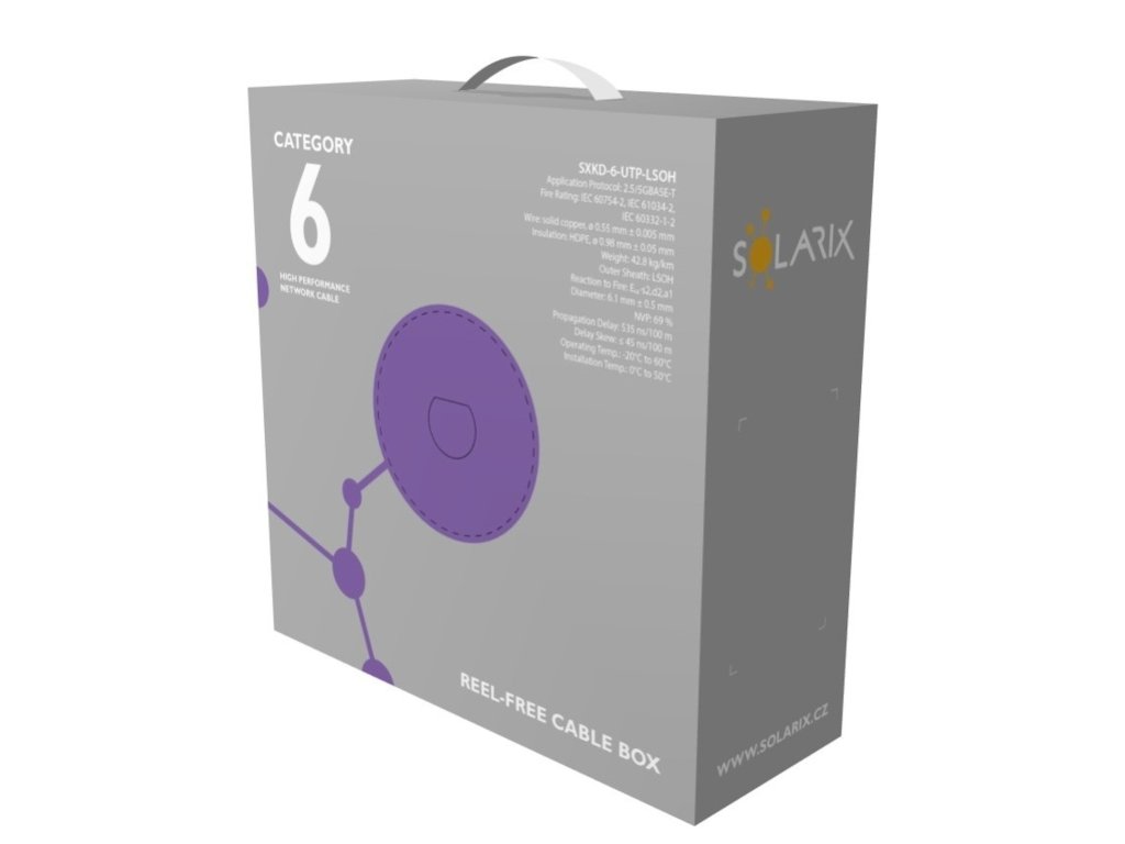POZOR, nový 100m box. Instalační kabel Solarix s označením SXKD-6-UTP-LSOH je spolehlivý nestíněný kabel kategorie 6, který je testován až do šířky pásma 450 MHz, a je určený pro provoz ethernetových protokolů, včetně 2.5GBASE-T a 5GBASE-T. Konstrukce kabelu je U/UTP s plastovým křížem, který zajišťuje maximální oddělení párů od sebe po celé délce kabelu. Typ pláště je LSOH s třídou reakce na oheň Dca-s2,d2,a1. Vodiče kabelu jsou vyrobeny z kvalitního měděného drátu s čistotou mědi 99,97%. Kabel bez problémů splňuje požadavky z mezinárodních standardů ISO/IEC 11801, EN 50173 a ANSI/TIA 568.2-D. Výkonové parametry tohoto kabelu byly otestovány nezávislou testovací zkušebnou FORCE TECHNOLOGY v rámci programu EC Verified, a to na nejvyšší úroveň tzv. Component Level. Certifikát je k dispozici zde na webu v záložce "Soubory ke stažení" nebo přímo na stránkách laboratoře FORCE. V případě CPR (nařízení EU č. 305/2011) je kabel testován v systému posuzování vlastností AVCP 3. Stejně jako ostatní kabely Solarix, je i kabel SXKD-6-UTP-LSOH značen metráží po 1 m v rozsahu od 0 do 100 m. Kabel je dodáván ve vysoce odolném třívrstvém leštěném kartónovém boxu, na kterém jsou uvedeny všechny nezbytné produktové informace, včetně čárových kódů, výrobní šarže, popisu a nejdůležitějších technických parametrů.Klíčové vlastnosti kabelu Solarix kategorie 6