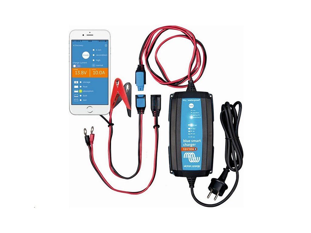 Nabíjačku Blue Smart IP65 môžete nastaviť, prezerať a konfigurovať prostredníctvom smartfónu. Môžete zobraziť stav nabíjačky a batérie. Dokonca môžete ovládať funkcie nabíjačky pomocou aplikácie VictronConnect. Na obrazovke sa zobrazuje predvolená hodnota napätia a prúdu. Aplikáciu pre systémy iOS a Android si môžete stiahnuť zde. Aplikáciu VictronConnect si môžete bezplatne stiahnuť aj na Google Play alebo v App Store.