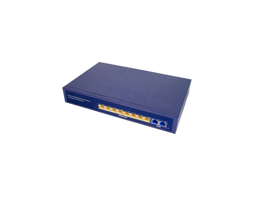 Aktivní 8 portový switch s POE. Automaticky detekuje a napájí zařízení podporující PoE normu 802.3af (max.15 W / port) a to na portech 1 až 8. Port č.9 slouží jako uplink a nepodporuje PoE.