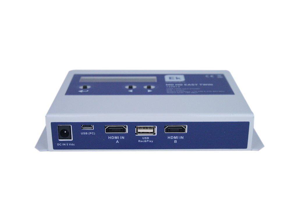 ITS MODULATOR MD HD EASY TWIN Vynikající kvalita modulace MER => 33 dB Rozlišení až 1080p Dva HDMI vstupy Aktivní indikace zdroj HDMI USB rekordér / přehrávač Quick Menu. Snadné nastavení pomocí tlačítek kanál a útlum Advanced snadné programování pomocí PC programu VIDEO: 480p rozlišení videa - 576p - 720p - 1080i - 1080p Komprese videa H.264 Video Kbps Rychlost 500-15000 AUDIO: Komprese zvuku MPEG1-L2, AAC-LC Frekvence zvuku Kbps 128, 192, 256, 320 Modulace: Zpracování DVB-T NIT, PID nastavení DVB NID, onid, ID sítě, sítě jméno, TS ID, Program ID, Program pojmenovat, PMT PID, Video PID, Audio PID Výstupní frekvence 170 - 230 MHz a 470-862 Výstupní kanál N. 5 ... 12 + 21 ... 69 Výstupní úroveň DBuV >80 0 ... 15 dB útlum MER dB => 33 MHz šířka pásma 6, 7, 8 Konstelace QPSK, 16QAM, 64QAM 2K režim, 8K FEC 1/2, 2/3, 3/4, 5/6, 6/7 Ochranný interval 1/4, 1/8, 1/16, 1/32 LCN EACEM, ITC, Nordig Smyčka RF -2 dB Parametry: 5 Vdc napájecí napětí Příkon W <5 Zdroj je součástí balení Rozměr mm 170 x 100 x 25 Hmotnost 600 g