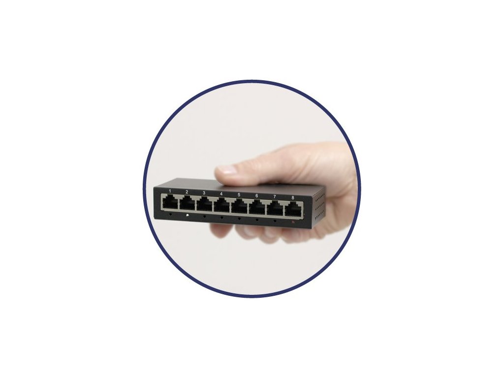 Switch Ethernet SW8 M s 8 porty: 10/100/1000 Mbps. Kompaktní velikost, kovové provedení.
