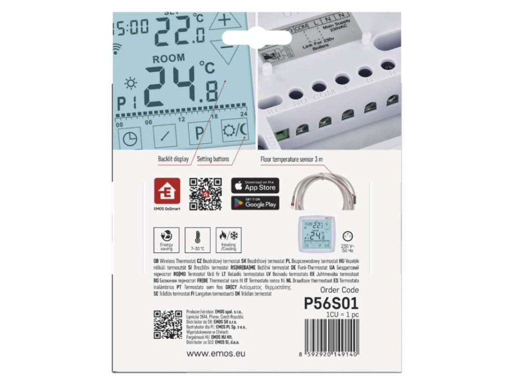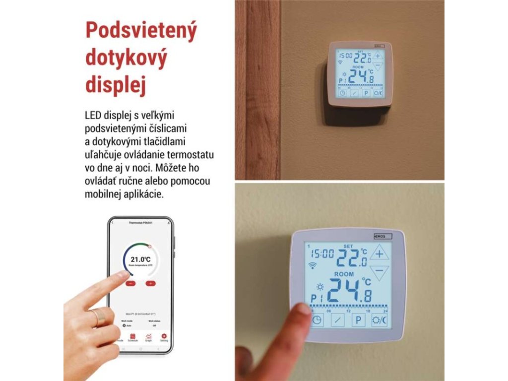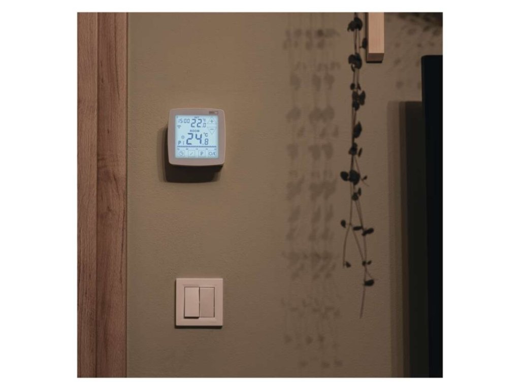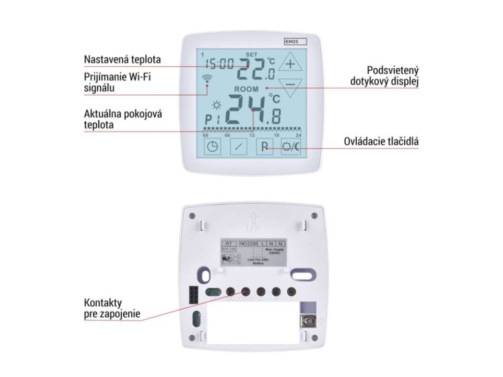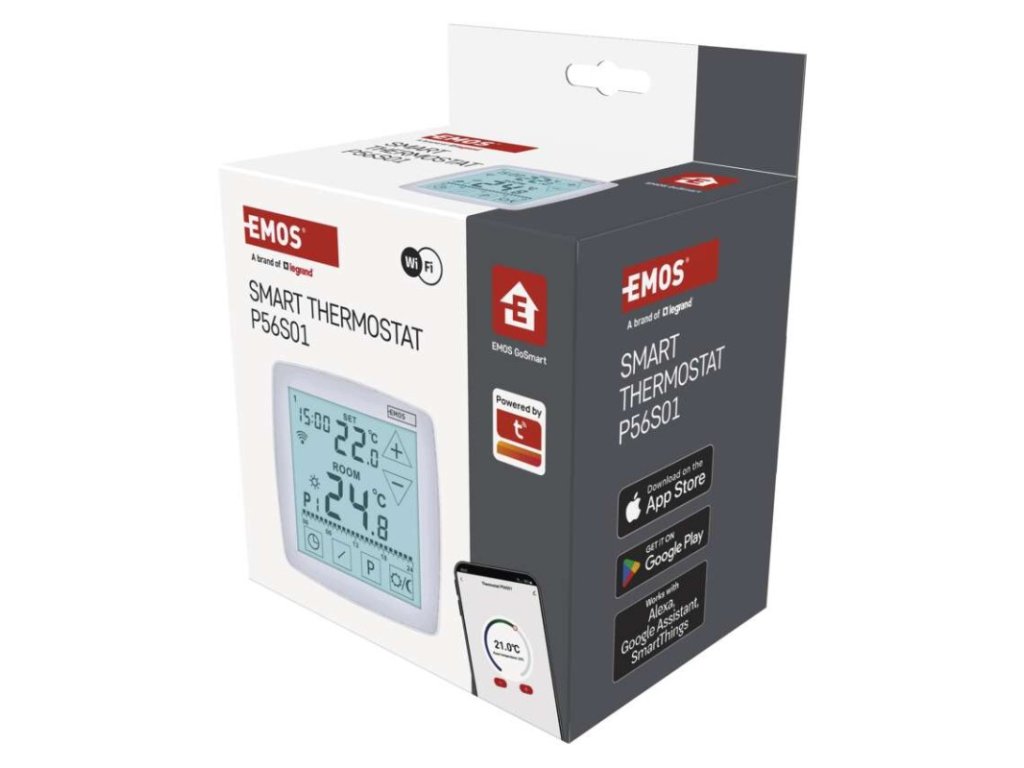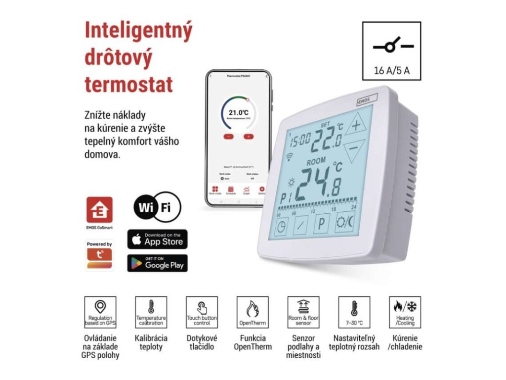 dĺžka kapilárneho čidla: –|dosah vo voľnom priestore: –|druh regulácie: vykurovací a chladiaci systém|farba: biela|funkcia ON/OFF: áno|funkcia prázdniny: áno|funkcia Set-back: nie|jazyky aplikácie: EN, CZ, SK, PL, DE, HU, SI, FR, + 60 ďalších jazykov|kalibrácia teploty: áno|kompatibilita: EMOS GoSmart, TUYA, LIDL, Smartlife, otvorený systém|meranie teploty: 0 °C až 40 °C, rozlíšenie 0,1 °C|možnosť prepojenia s ďalšími detektormi: nie|napájanie: 230 V AC|napájanie brány: –|napájanie prijímača: –|napájanie vysielača: –|nastavenie teploty: 7 ° C až 30 ° C, po 0,2 ° C|nastaviteľný rozptyl teploty: #|notifikácie do mobilnej aplikácie: áno|ochrana proti zamrznutiu: áno|ovládanie hlasovými asistentmi: áno (Amazon Alexa, Google Assistant)|počet programov: 6 + 3 užívateľsky nastaviteľné|podlahový senzor: NTC 10 kΩ, 3 m|podporované OS: Android, iOS|podsvietený displej: áno|pracovná frekvencia: –|predajný obal: 1 ks, krabička|prenosová frekvencia: 2,4 GHz WIFI (IEEE802.11b/g/n)|protokol: Wi-Fi|rozmer: 98 × 37 × 98 mm|rozmer brány: –|rozmer prijímača: –|rozmer vysielača: –|spínaná záťaž: 16 A odporovo, 5 A induktívne|spínanie: 230 V AC alebo beznapäťové|súčasť balenia: termostat, podlahové čidlo 3 m, Ø 8 mm|typ nastavenia teploty: komfortná a úsporná teplota|typ ovládania: programovateľný elektronický izbový termostat, možnosť ovládania cez mobil (iOS, Android)|typ termostatu: drôtový s OpenTherm komunikáciou + podlahové kúrenieDodatočné parametre