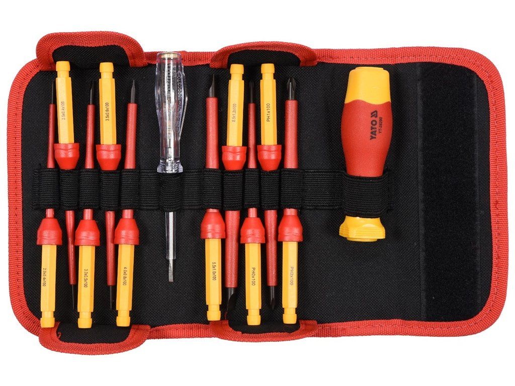 Izolovaný skrutkovač v súprave s 10 vymeniteľnými hrotmi a skúšačkou napätia.