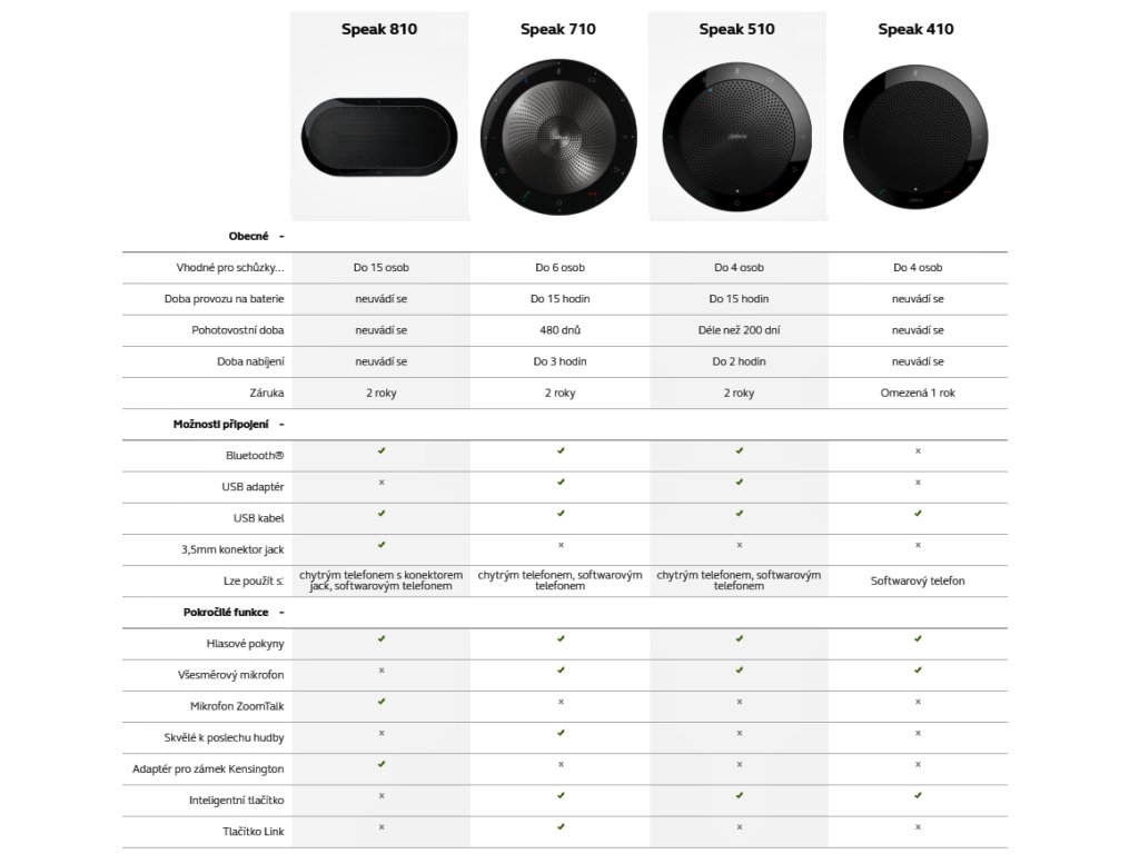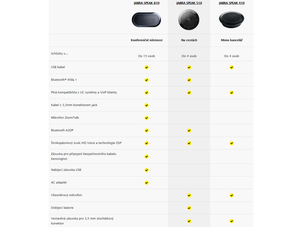 Kompaktní řada přenosných hlasových komunikátorů s USB konektorem a Bluetooth určená pro konferenční hovory, které můžete připojit pomocí USB konektoru k vašemu počítači, tabletu nebo smartphonu a hovory tak uskutečnit kdykoliv a odkudkoliv. Provedení: Provedení na stůl Konektivita: USB/BT Připojení: Možnost připojení k PC (SW telefon), mobilní telefon Mikrofon: Vícesměrový/filtr hluku Funkce ztlumení: ano - Ztlumení vám dává možnost ztlumit/zrušit ztlumení mikrofonu přímo na zařízení Reproduktor: Hifi / Širokopásmový zvuk Bezdrátová technologie: Bluetooth - Podporuje Bluetooth Dosah – až 100 metrů Baterie a napájení: Doba hovoru: až 15 hodin - doba hovoru je maximální doba, po kterou můžete hovořit, než dojde k vybití zdrojů napájení Podporované technologie: Digitální zpracování signálu - DSP (Digital Signal Processing) je technologie, která digitálně optimalizuje váš hlas i hudbu a potlačuje ozvěnu Obsah balení: Komunikátor, Jabra Link 360 Bluetooth, pouzdro Odkaz na web výrobce: http://www.jabra.cz/products/pc_headsets/jabra_speak__510_series/jabra_speak_510_ Srovnání variant: Jabra SPEAK SERIES se prodává v 6 variantách: - Jabra SPEAK 410: pouze USB připojení k PC - Jabra SPEAK 410 MS: stejné funkce jako 410, navíc optimalizováno pro MS Skype (nemusí se instalovat žádné ovladače, stačí pouze připojit) - Jabra SPEAK 510: stejné funkce jako 410, navíc obsahuje Bluetooth pro propojení k tabletu/smartphone - Jabra SPEAK 510 MS: stejné funkce jako 510, navíc optimalizováno pro MS Skype (nemusí se instalovat žádné ovladače, stačí pouze připojit) - Jabra SPEAK 510+: stejné funkce jako 510, navíc umožňuje propojit PC přes Bluetooth, součástí balení je BT USB adaptér - Jabra SPEAK 510+ MS: stejné funkce jako 510+, navíc optimalizováno pro MS Skype (nemusí se instalovat žádné ovladače, stačí pouze připojit)Dodatočné parametre