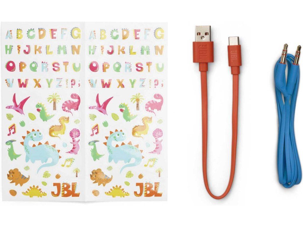 Balenie bez plastov sa dá zložiť do zábavného stojana na zariadenie a súčasťou balenia je aj hravá súprava samolepiek JBL, aby si deti mohli svoje slúchadlá prispôsobiť.