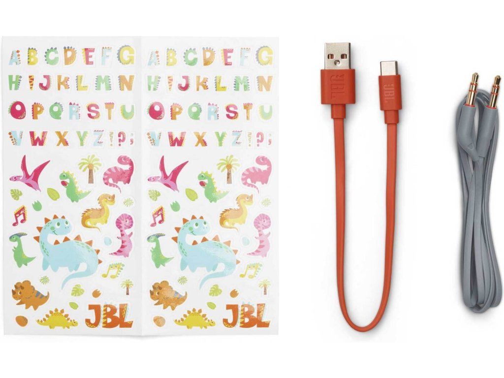 Balenie bez plastov sa dá zložiť do zábavného stojana na zariadenie a súčasťou balenia je aj hravá súprava samolepiek JBL, aby si deti mohli svoje slúchadlá prispôsobiť.