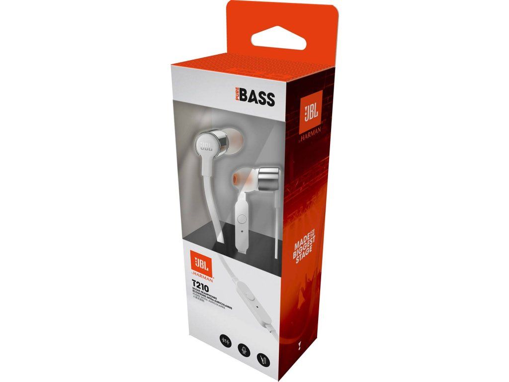 Predstavujeme vám slúchadlá do uší JBL T210. Sú ľahučké, pohodlné a kompaktné. Pod odolným krytom slúchadiel s kovovou úpravou, je pár 8,7 mm meničov katapultujúcich seriózne basy, pričom dochádza k reprodukovaniu JBL Pure Bass zvuku, aký ste zažili v koncertných sálach, na štadiónoch a v nahrávacích štúdiách po celom svete. Okrem toho, jedno-tlačidlový diaľkový ovládač na plochom kábli odolnom voči zamotaniu, vám umožňuje ovládať prehrávanie hudby, ako aj prijímať telefonické hovory za pochodu s pomocou vstavaného mikrofónu, čo robí z JBL T210 vášho každodenného spoločníka v práci, v domácnosti a na cestách.