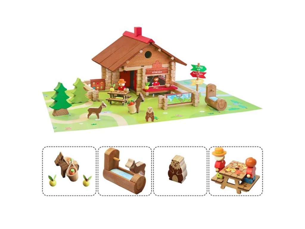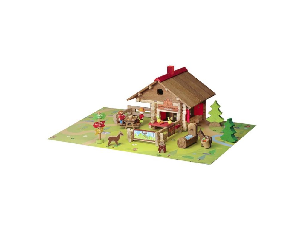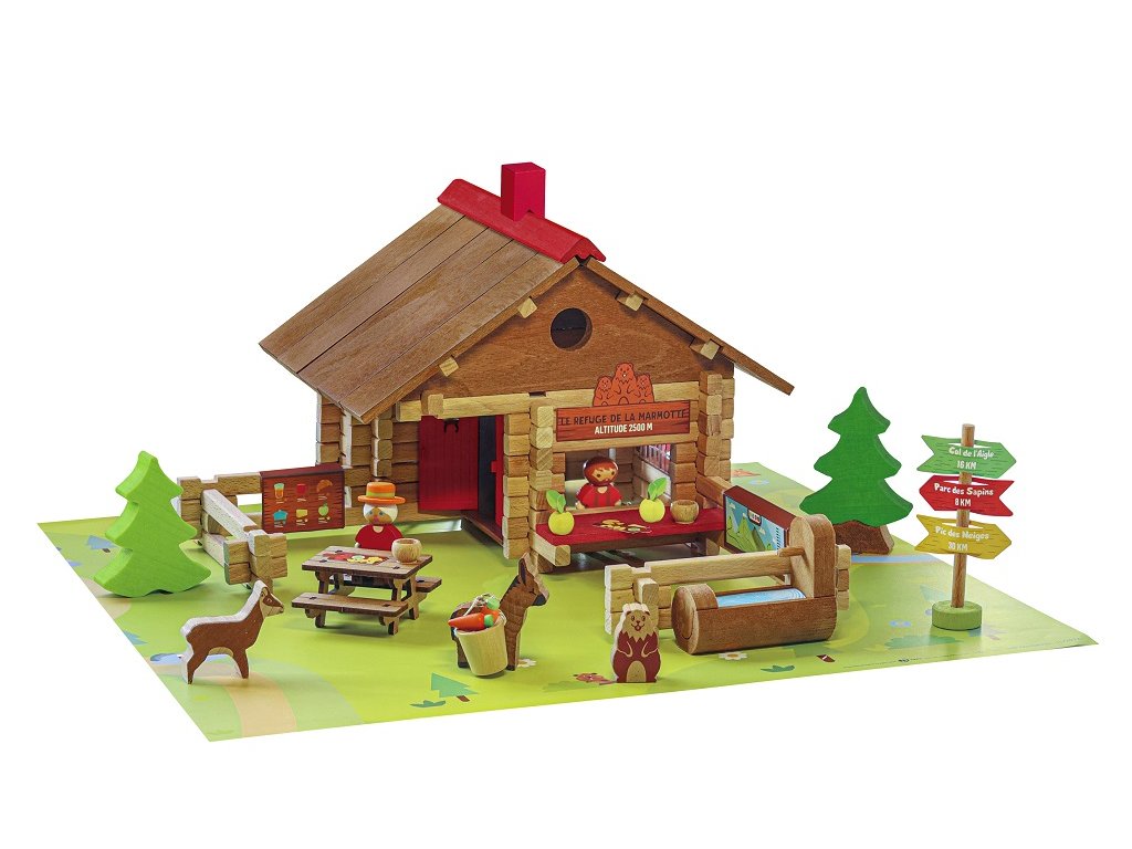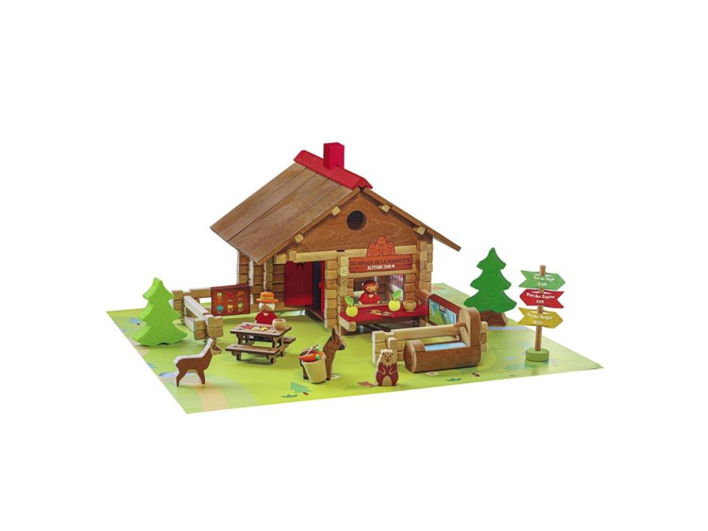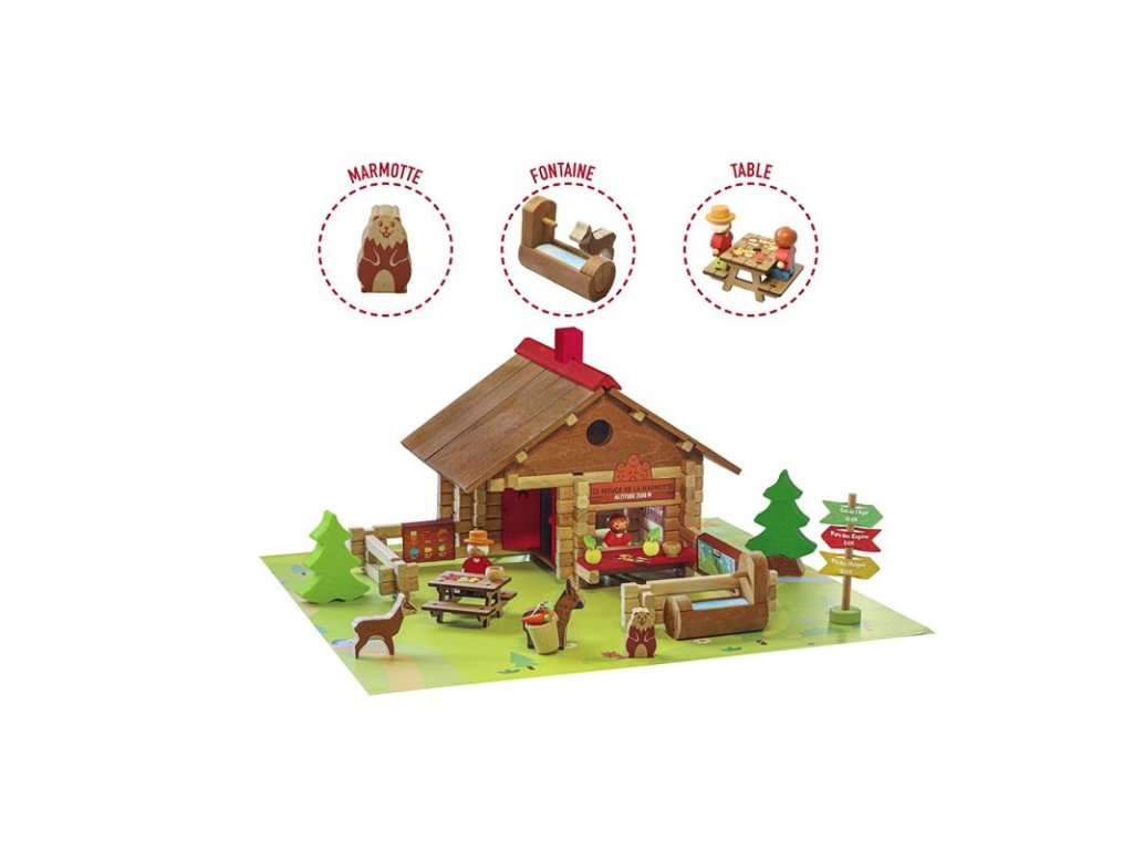 Co může být krásnější než procházky v horách? Procvičte svou obratnost a představivost při stavbě útočiště svišťů! Tento krásný domeček z mořeného dřeva je opatřen také piknikovým stolem, fontánou či roztomilými obyvateli (např. oslem, kamzíkem a svištěm). Stavebnice Jeujura Constructions mají dlouhou tradici a patří mezi klasické francouzské hračky. Nabízí série tématicky věnované chatám, domkům a farmám, ale také divokému západu a středověku. Dají se mezi sebou volně kombinovat a k řadě z nich je také nabízeno příslušenství, figurky a vozidla. Jsou vyráběny ve Francii, z masivního bukového a borovicového dřeva francouzského původu. Dílky jsou ošetřeny výhradně za použití barev a laků na bázi vody. Každá sada je balena v praktickém lepenkovém kufříku potištěném rostlinnými inkousty a součástí balení je snadno pochopitelný návod. Hlavní vlastnosti: 150 dílků z masivního dřeva a podložkapraktické balenívyrobeno ve FranciiDodatočné parametre