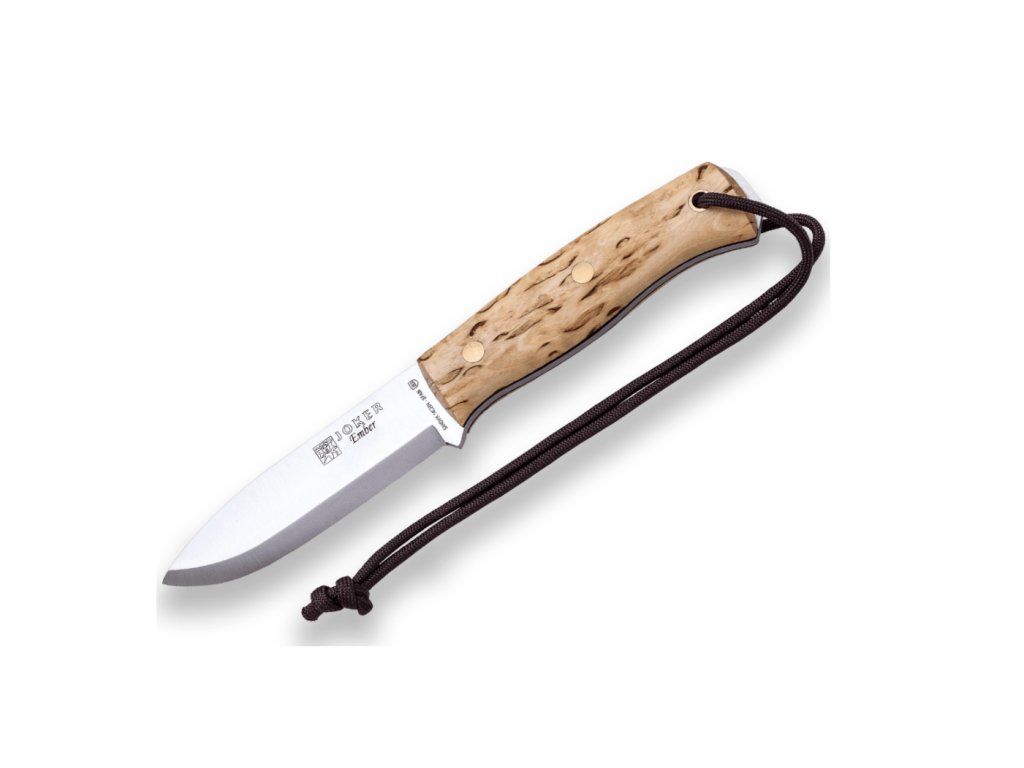 JOKER CL122 Ember Scandi vonkajší nôž 10,5 cm, drevo kučeravej brezy, kožené puzdro, šnúrka