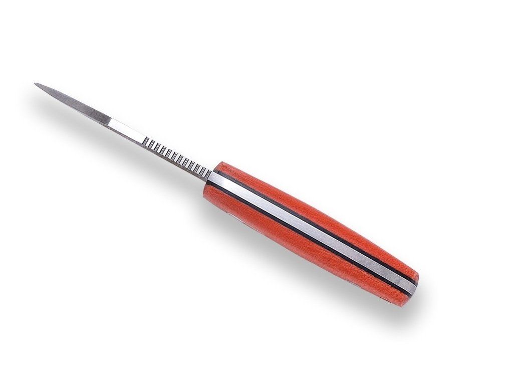 Tvarovaná rukoväť je vyrobená z odolného materiálu Micarta oranžovej farby. S otvorom na šnúrku.