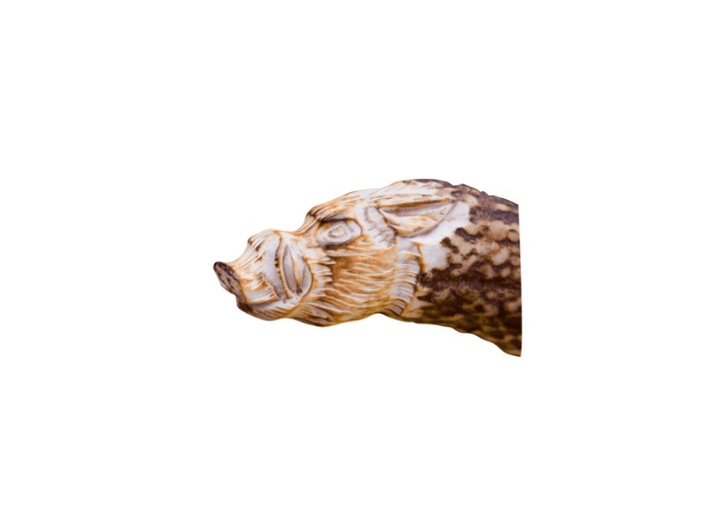 S rukoväťou z pravého parohu, ozdobená vyrezávaným motívom v spodnej časti - kančia hlava.