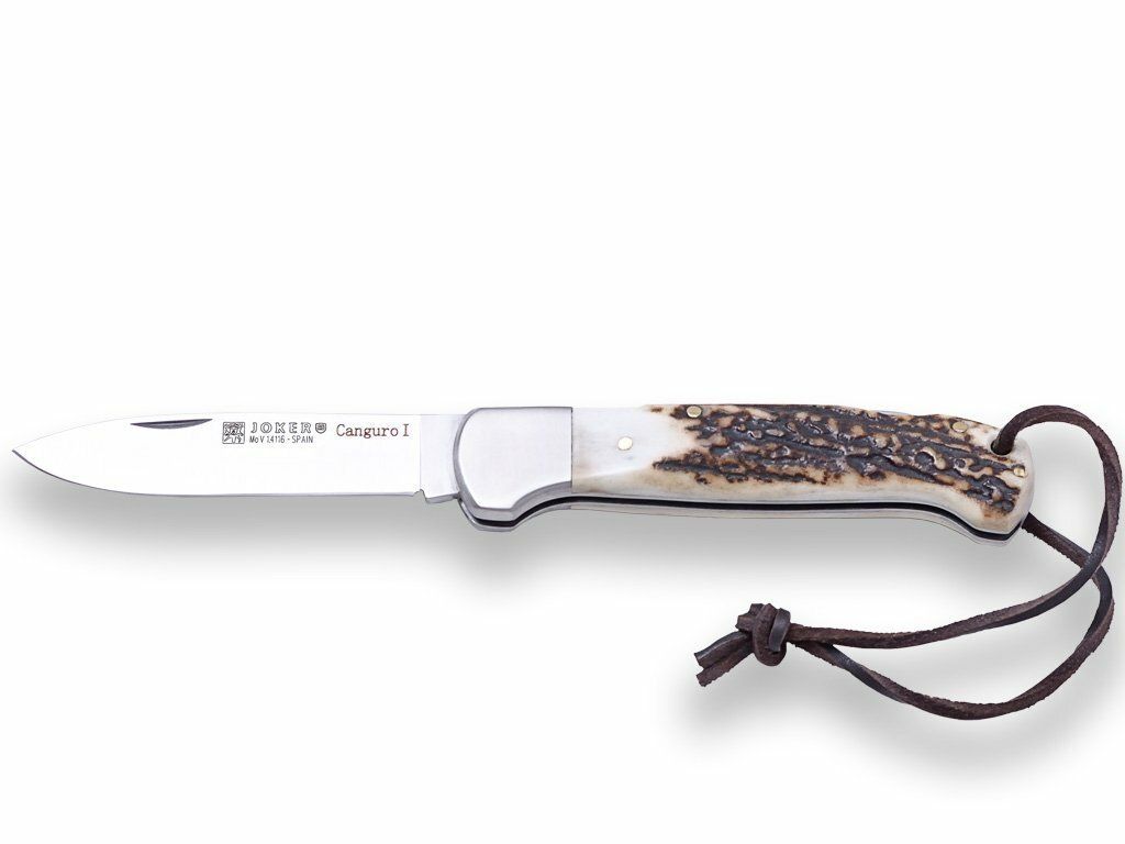 JOKER NC129 Canguro vreckový lovecký nôž 8,5 cm, paroh, kožená šnúrka