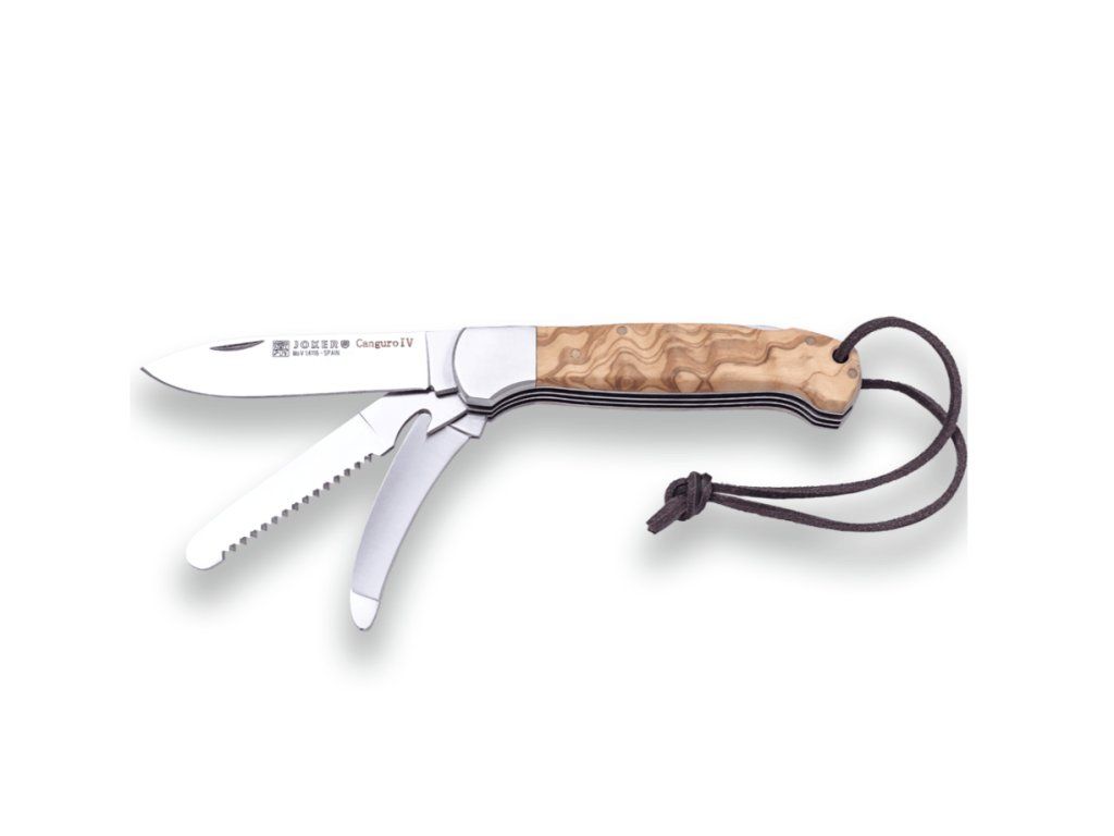JOKER NO128 Canguro 4 USOS multifunkčný lovecký nôž 8,5 cm, olivové drevo, šnúrka