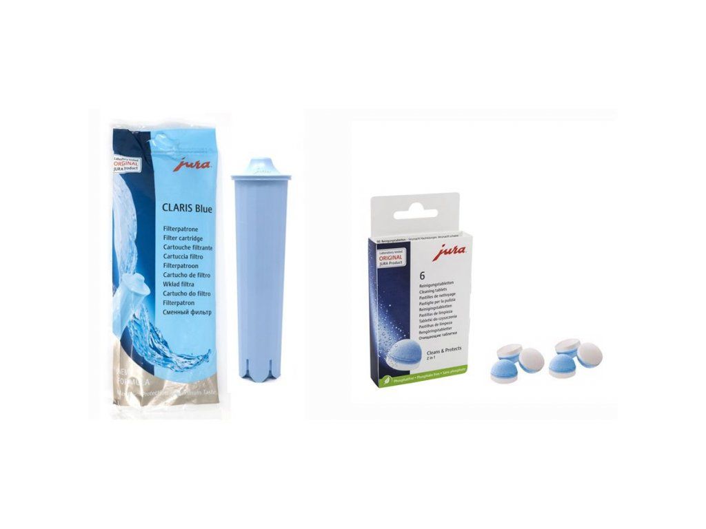 Originální filtr Jura Claris Blue + Jura čisticí tablety 6 ksProč záleží na kvalitní vodě a čistém kávovaru?Už jste si všimli, že stejná káva může chutnat pokaždé trochu jinak? Hlavní důvod je kvalita vody a čistota vašeho kávovaru. Dopřejte svému kávovaru pravidelnou péči a každé ráno si vychutnáte kávu přesně takovou, jakou máte nejraději.Vodní filtr Jura CLARIS Blue+ Káva se skládá z 98 % z vody, a proto je kvalitní filtrace klíčová pro dokonalou chuť. Filtr Jura CLARIS Blue+ kombinuje švýcarskou technologii iontové výměny s přírodními aktivními složkami uhlí pro maximální ochranu a hygienu už v zásobníku vody.Proč používat CLARIS Blue+? Není třeba odvápňovat – filtr eliminuje vodní kámen. Delší životnost kávovaru – ochrana všech komponentů uvnitř kávovaru. Čistější chuť – žádná cizí pachuť, plné aroma kávy.Životnost filtru je 50 litrů (cca 350 káv) nebo 2 měsíce používání.Kompatibilní s modely: JURA ENA Micro 90 JURA A1 JURA A7 JURA C65 JURA F9Tip: Jaký typ filtru použít pro váš kávovar, naleznete na patici nádobky na vodu (zbarvena modře -> Jura CLARIS Blue).Třífázové čisticí tablety (6 ks) Víte, co ovlivňuje chuť vaší kávy? Čistota varné jednotky. Kávové oleje a usazeniny postupně mění chuť, a právě proto Jura vyvinula unikátní třífázový systém čištění.Jura 3fázová čisticí tableta spolehlivě odstraňuje mastnotu z kávy. Kromě čištění také utěsňuje všechny trubky a oddaluje usazování kávového tuku s trvalou účinností. Navíc je v rámci jejich použití zajištěna trvalá ochrana před usazováním minerálů.Švýcarská preciznost S filtrem a čisticími tabletami Jura investujete do prověřené technologie od světového lídra v automatických kávovarech. Pravidelná péče s originálními produkty vám zaručí, že si budete svou kávu užívat v té nejvyšší kvalitě.Poznámka:• Přesný popis použití tohoto výrobku naleznete v návodu svého přístroje.Bezpečnostní zdroje JURA Czech s.r.o., Poděbradská 1020/30, 190 00 Praha 9Tel.: 848 808 404summary::-webkit-details-marker { display: none; } summary::marker { display: none; }Dodatočné parametre