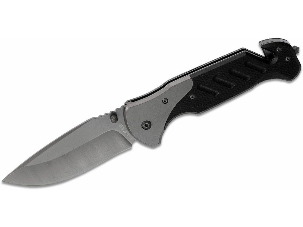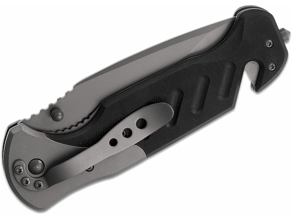 Rukoväť je z kombinácie odolného G10 čiernej farby a ocele so šedým povrchom. V spodnej časti má rezač bezpečnostných pásov a rozbíjač skla.
