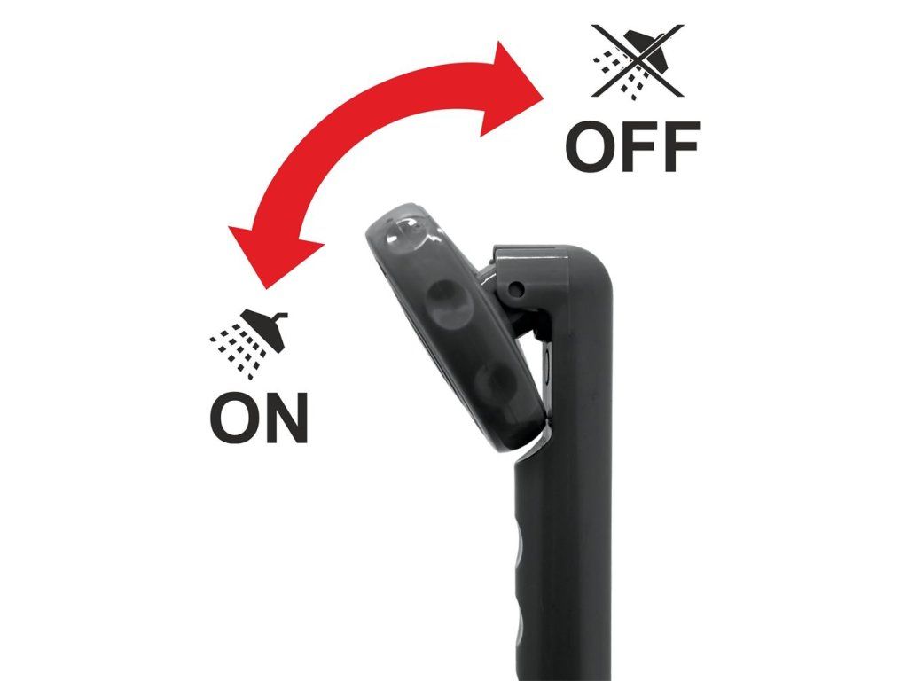 Sprcha má ergonomickou hlavici s funkcí vypnutí průtoku pouhým sklopením, což šetří vodu. Díky 2m gumové hadici se šroubovacími koncovkami a těsněním je spojení čerpadla se sprchou pevné a spolehlivé. Sprchu lze snadno zavěsit na háček nebo upevnit pomocí přísavky – obojí je součástí balení.