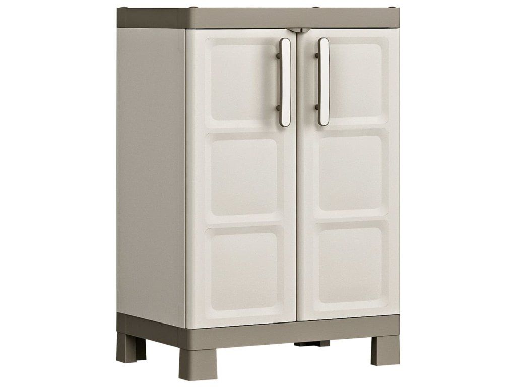 Vďaka elegantnému kontrastnému farebnému dizajnu bude táto skrinka pútavým prvkom v každej garáži, práčovni alebo šatni. Vďaka svojmu priestorovo úspornému dizajnu je táto skrinka obzvlášť vhodná pre malé priestory a dá sa dokonca umiestniť pod schody. Táto skrinka obsahuje 2 nastaviteľné police, každá s maximálnou nosnosťou 15 kg a uzamykateľné dvere s ergonomickými rúčkami, a je ideálna na bezpečné uloženie rôznych vecí. Má vyvýšené nožičky, čo uľahčuje čistenie podlahy.