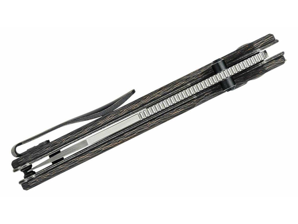 Má čepeľ s hladkou hranou z nerezovej ocele CPM-20V so saténovým povrchom, otvára sa palcovým kolíkom a zaisťuje ju zámok tlačidiel Button Lock.