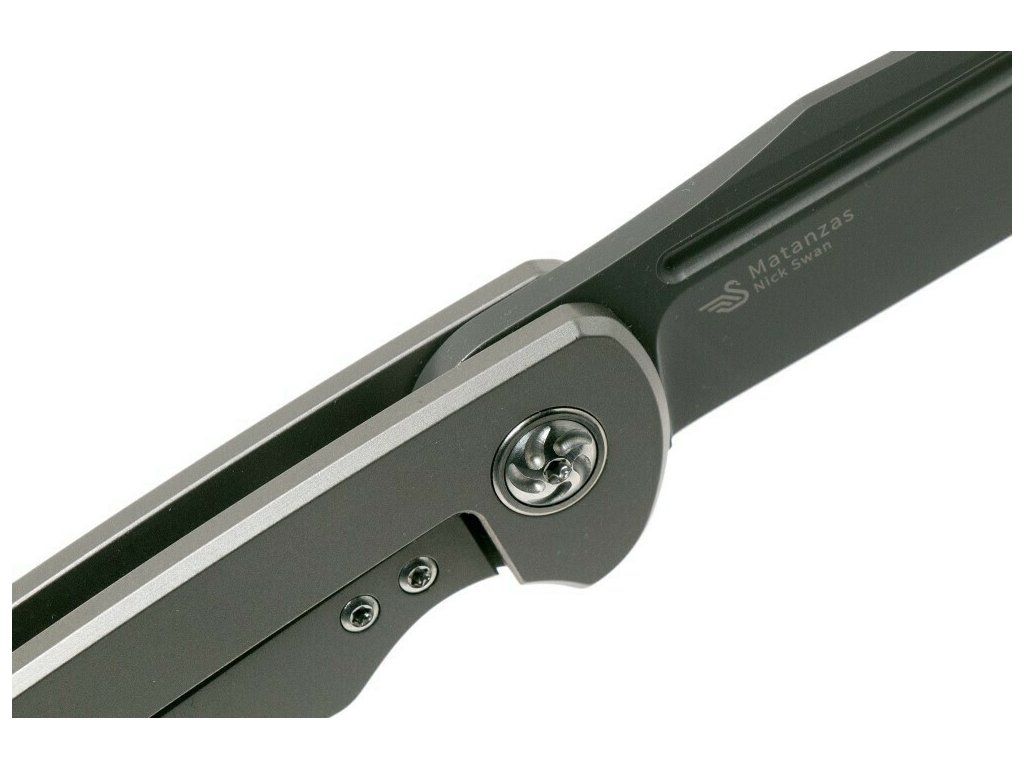 Má čepeľ s hladkou hranou z ocele CPM-S35VN so šedým povrchom, otvára sa guľôčkovými ložiskami cez vyklápač Flipper a zaisťuje ju poistka Framelock.