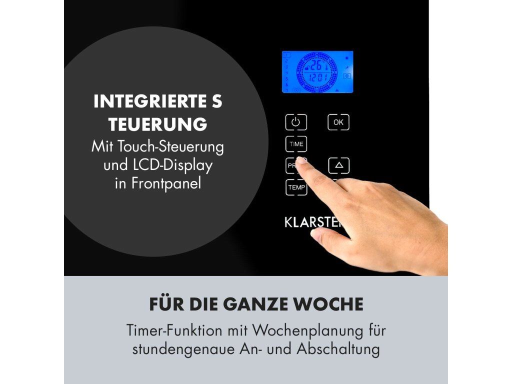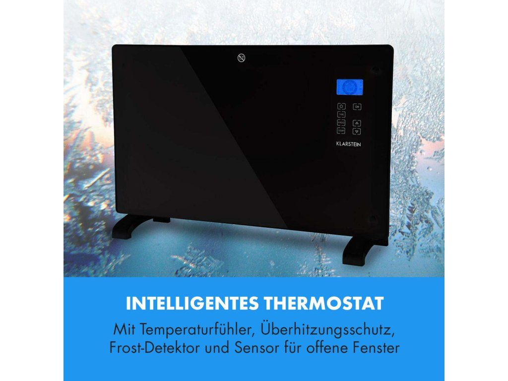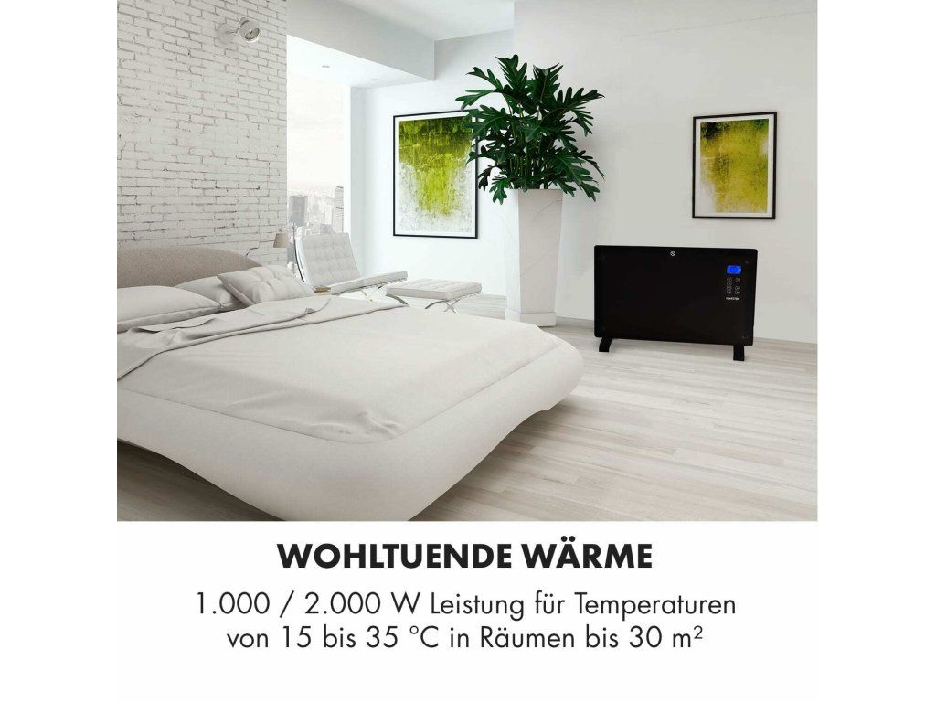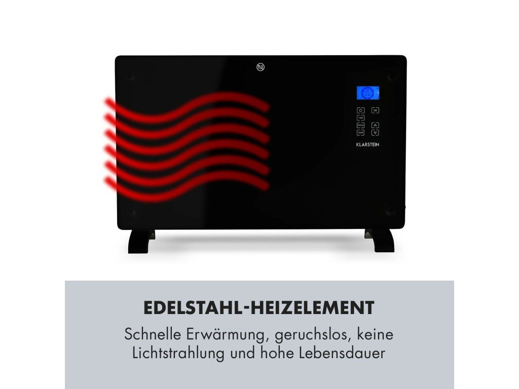 Čierna elegancia vzbudzuje príjemné pocity a teplo pre tých, ktorí sa cítia najlepšie v papučiach a v pyžame. Konvekčný ohrievač Klarstein Norderney sa postará o rovnomerné vyhrievanie a rozdelenie vykurovacieho vzduchu v miestnostiach s veľkosťou 30 m²/70 m³. Prostredníctvom dvoch vykurovacích úrovní ohrieva ohrievač Klarstein s výkonom 2000 W priestory podľa želania na 15 až 35 °C. Vykurovacie teleso z ušľachtilej ocele má okrem toho mnoho výhod: vyznačuje sa rýchlym a predovšetkým nepáchnucím teplom a tiež dlhou životnosťou. Vďaka snímaču teploty termostat udržiava požadovanú teplotu na stupeň presne. Detektor mrazu chráni priestory pred podchladením a poškodením mrazom tým, že nedovolí teplote klesnúť pod 5 °C. To nie je všetko, senzor tiež rozpozná, ak sú v miestnosti otvorené okná a vypne zariadenie. Ochrana pred prehriatím a mimoriadne úsporný režim Eco sú tiež zahrnuté v rozsahu funkcií. Pri použití časovača sa konvekčný ohrievač zapne a vypne na minútu presne podľa nastavení a možno ho naprogramovať na celý týždeň. Vďaka ochrane proti striekajúcej vode IP24 je zariadenie Norderney možné umiestniť aj vo vlhkých miestnostiach, ako sú kuchyňa alebo kúpeľňa. Flexibilná je aj inštalácia, ktorá je možná buď vo forme stojaceho zariadenia, alebo nástenná montáž - príslušný montážny materiál, resp. nožičky sú súčasťou dodávky. Všetky nastavenia možno realizovať priamo na dotykovom paneli zariadenia. Integrovaný LCD displej prehľadne poskytuje informácie o vybraných funkciách a zobrazuje teplotu v miestnosti. Elegantný čierny predný panel vyrobený z 5 mm hrubého skla dodá každej miestnosti luxusný nádych. Ohrievač Klarstein Norderney zhodnotí každý priestor a postará sa o príjemné teplo Vášho bývania počas celého týždňa - bez ohľadu na to, ako chladno je vonku. Všimnite si, prosím: Zariadenie je určené len na použite v dobre izolovaných miestnostiach alebo na príležitostné použitie.Najväčšie výhody: