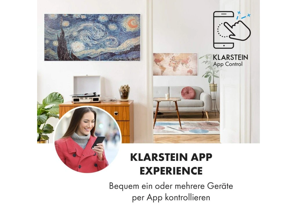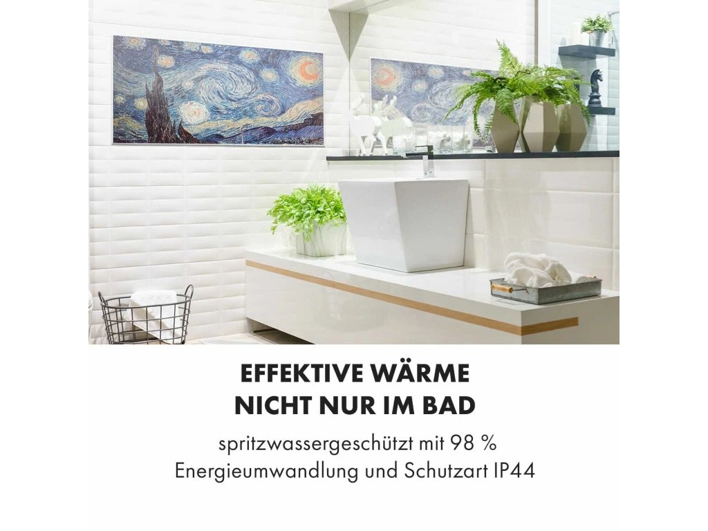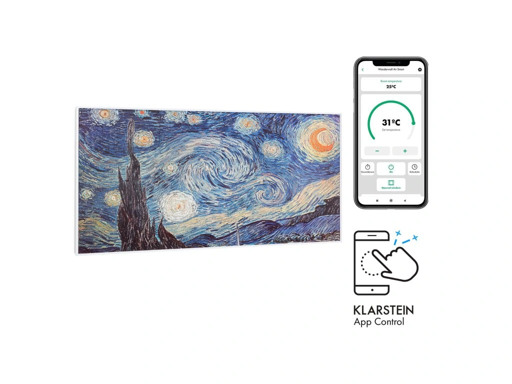 So smart technológiou na vytvorenie príjemného tepla: infračervený ohrievač Klarstein Wonderwall Air Art Smart prináša teplo do každej miestnosti veľmi efektívnym a priestorovo úsporným spôsobom a zároveň prináša so svojím povrchom s potlačeným grafickým dizajnom do miestnosti aj nový lesk a farby.Infračervený ohrievač Klarstein Wonderwall Air Art Smart predstavuje revolúciu vo vykurovaní vďaka modernej technológii. Super plochý vykurovací panel môžeš zavesiť ako obraz priamo na stenu, kde okamžite začne vykonávať svoju zohrievaciu službu mimoriadne priestorovo úsporne. So svojím výkonom 700 W využíva vďaka technológii IR ComfortHeat princíp slnečného tepla: namiesto pomalého zohrievania vzduchu vydáva príjemné infračervené žiarenie, ktoré priamo zohrieva osoby a predmety na ploche približne 14 m². Tvoj nový elektrický ohrievač je pritom mimoriadne energeticky efektívny: celých 98 % spotrebovanej energie sa premení na tepelné žiarenie. A pretože zariadenie Wonderwall pracuje len s tepelným žiarením, nevíri prach ani nevytvára hluk – preto je ideálnou voľbou pre alergikov a na použitie v priestoroch citlivých na hluk, ako sú kancelárie alebo spálne. Vďaka svojmu dizajnovému povrchu s grafickou potlačou je nielen zdrojom tepla, ale aj dekoratívnym pútavým doplnkom každej miestnosti.Teraz ešte inteligentnejší: nové infračervené ohrievače Klarstein Wonderwall Air Art Smart sa dajú pripojiť k miestnej sieti WiFi a potom sa dajú ovládať odkiaľkoľvek pomocou aplikácie Klarstein App Experience. Nemusíš ani chytiť svoj smartfón alebo tablet, pretože s integrovaným hlasovým ovládaním môžeš úplne jednoducho zadávať hlasové pokyny jednému zariadeniu alebo viacerým zariadeniam súčasne prostredníctvom Alexy alebo Google. Vykurovací panel sa dá, samozrejme, ovládať aj kompletne manuálne na zariadení.S termostatom a premyslenými funkciami, ako sú funkcia automatického vypnutia a detekcia otvoreného okna OpenWindow Detection, splní infračervený ohrievač aj náročné požiadavky. Nastaviteľný týždenný časový spínač umožňuje programovanie časov kúrenia na každý deň týždni. Vďaka svojmu plochému dizajnu, rýchlemu tepelnému výkonu a priestorovo úspornej montáži na stenu je ohrievač predurčený predovšetkým na použitie v kúpeľni. Preto je zariadenie Wonderwall Air Art Smart s triedou ochrany IP44 úplne chránené proti striekajúcej vode.Budúcnosť vykurovacej techniky: infračervený ohrievač Klarstein Wonderwall Air Art Smart.Najväčšie výhody:
