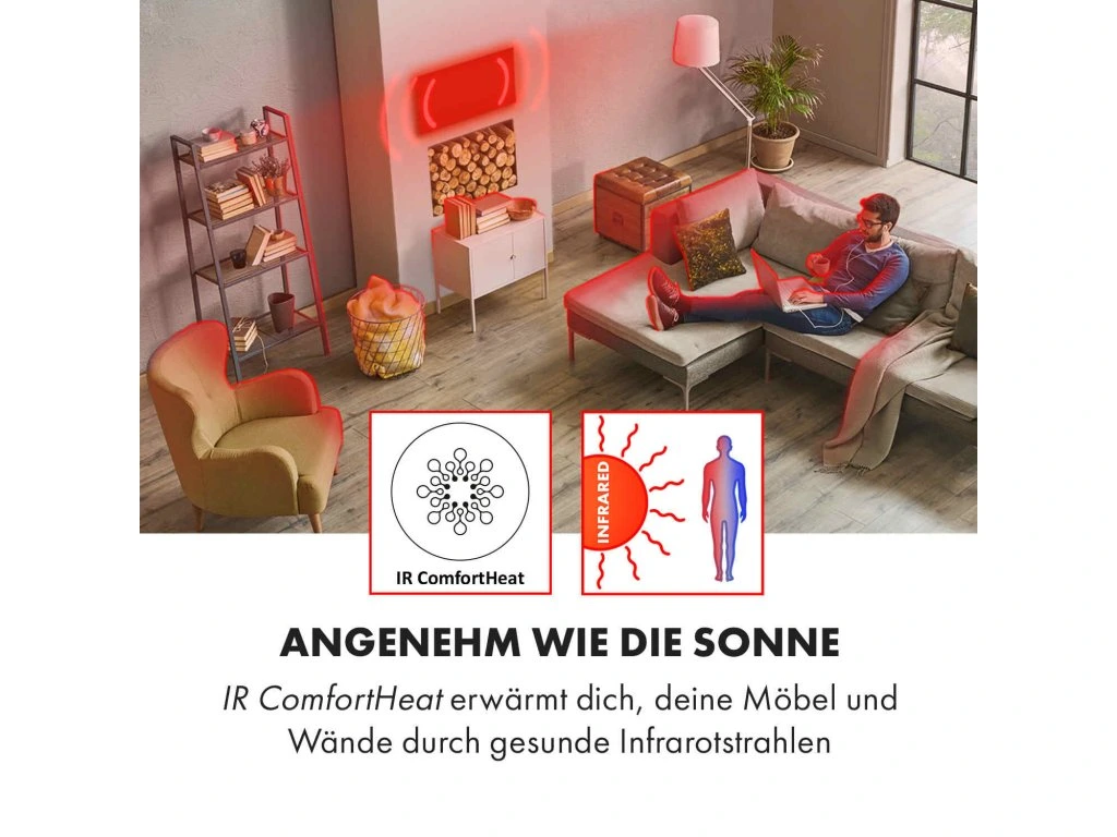 - Príjemný ako slnko: IR ComfortHeat zahreje teba, tvoj nábytok a steny zdravými infračervenými lúčmi