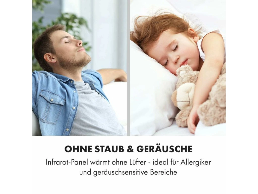 - Bez prachu & hluku: infračervený panel hreje bez ventilátora – ideálny pre alergikov a oblasti citlivé na hluk