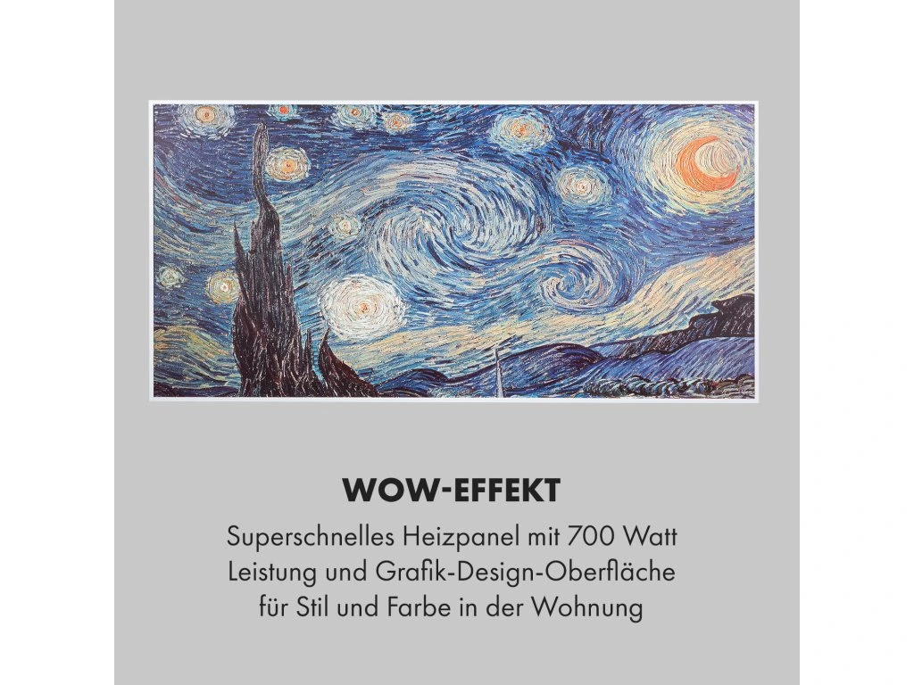 - Ohromujúci efekt: super rýchly vykurovací panel s výkonom 700 W a s povrchom s grafickým dizajnom pre štýl a farbu v byte